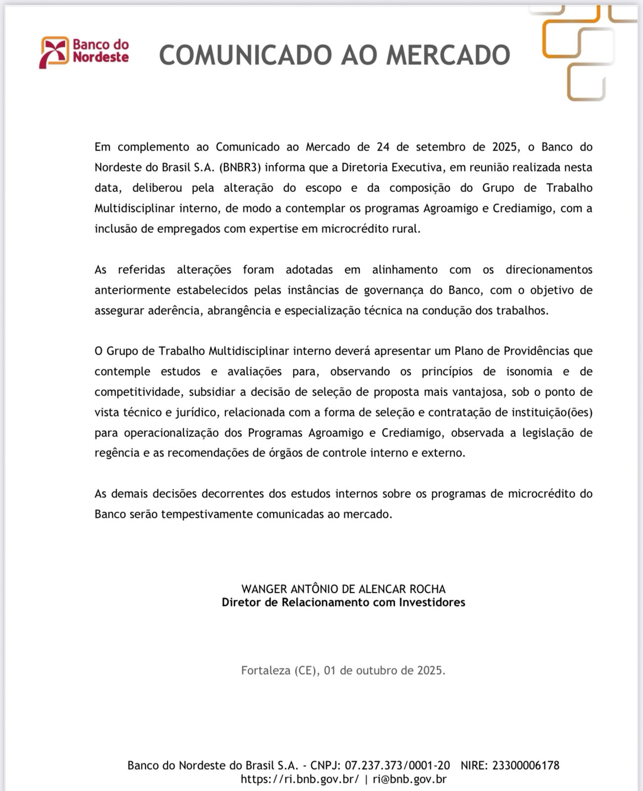 "Banco do Nordeste do Brasil S.A. (BNBR3) informa que a Diretoria Executiva, em reunião realizada nesta data, deliberou pela alteração do escopo e da composição do Grupo de Trabalho Multidisciplinar interno, de modo a contemplar os programas Agroamigo e Crediamigo, com a inclusão de empregados com expertise em microcrédito rural", assegura o texto do comunicado.