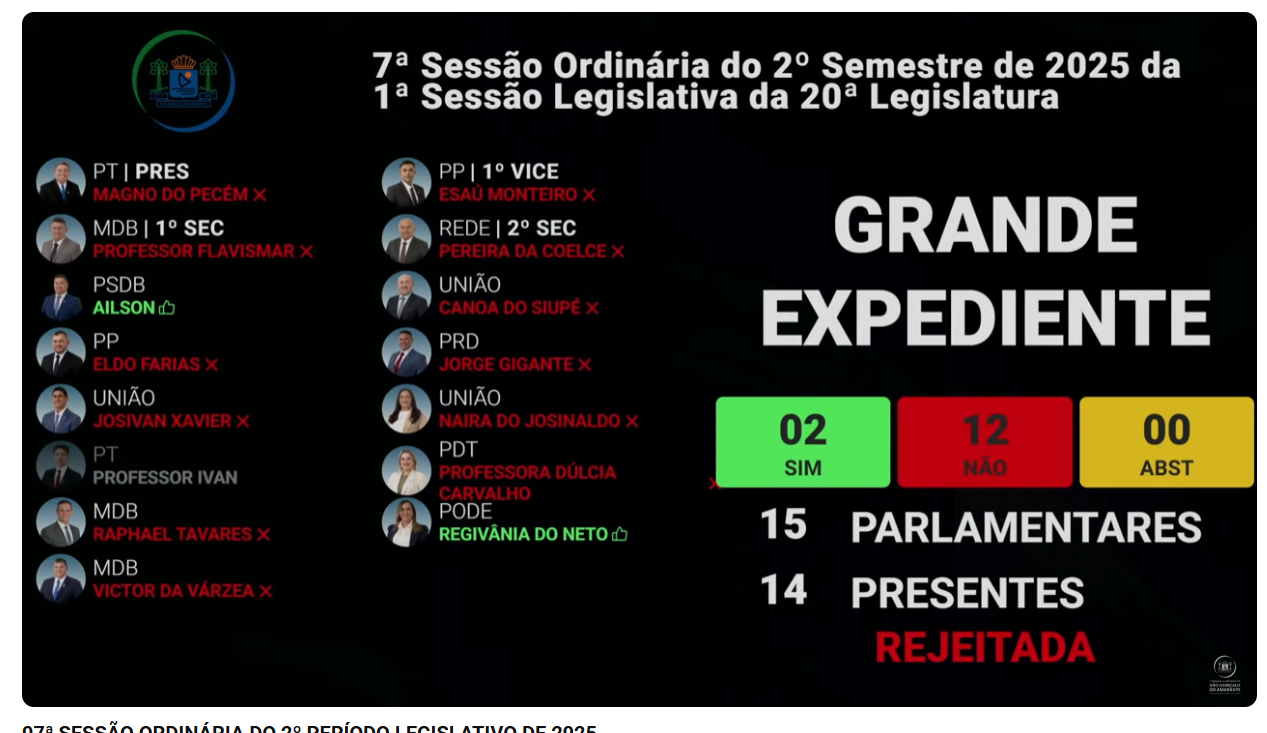 Foram 12 votos favoráveis pela desaprovação e 02 contrários