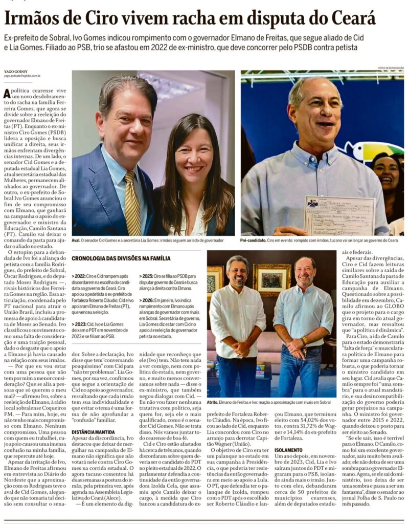 A convergência de pensamento entre os irmãos reacende especulações sobre uma eventual reaproximação entre Ciro e Cid em 2026, ainda que em campo político distinto. O O Globo, no entanto, destaca que os Ferreira Gomes seguem rompidos: Cid mantém apoio à reeleição de Elmano ao lado da irmã, a deputada estadual, Lia Gomes (PSB), enquanto o ex-prefeito de Sobral, Ivo Gomes (PSB), está se afastando do grupo governista e tende a se alinhar a Ciro.