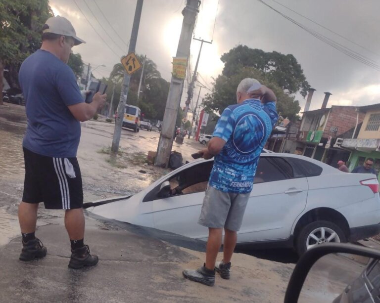 Asfalto cede e carro é engolido por erosão em rua do Bairro Coaçu, em Fortaleza