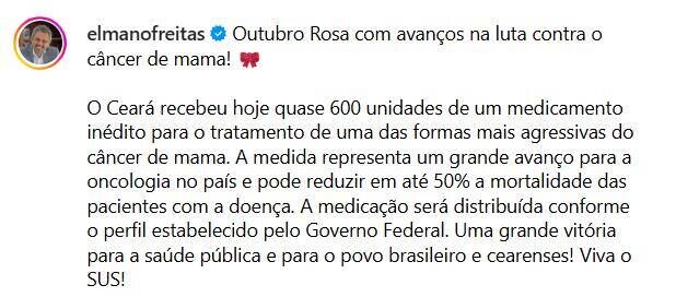 O anúncio foi feito pelo governador Elmano de Freitas, por meio das redes sociais. Ele destacou a importância da iniciativa para a estrutura de saúde pública do Ceará, que passa a integrar o primeiro grupo de estados a receber o medicamento.