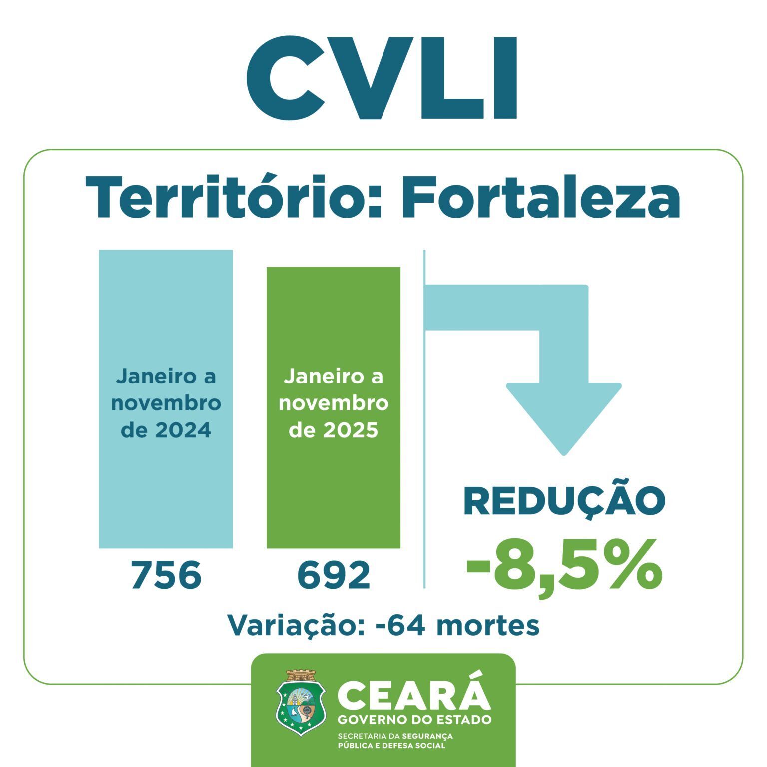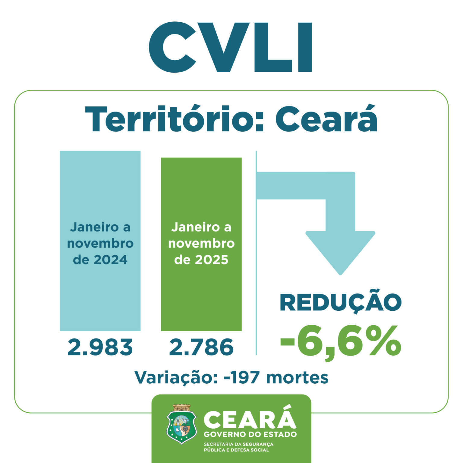 O Ceará encerrou os 11 primeiros meses de 2025 com redução nas mortes por Crimes Violentos Letais Intencionais (CVLIs). Entre janeiro e novembro, o Estado contabilizou 2.786 ocorrências, 197 a menos que no mesmo período de 2024, o que representa diminuição de 6,6%. Os dados são da Superintendência de Pesquisa e Estratégia de Segurança Pública (Supesp), vinculada à Secretaria da Segurança Pública e Defesa Social (SSPDS).