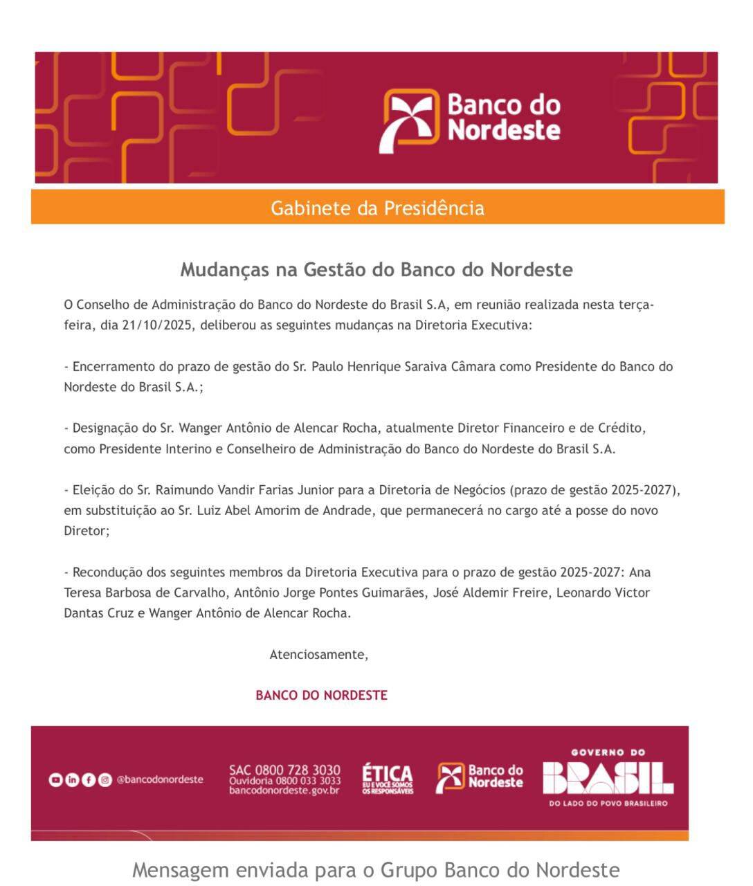 A decisão ocorre após um dia de intensas articulações em Brasília. Na segunda-feira (20), o Ministério da Fazenda havia sinalizado a indicação de Ana Teresa Carvalho para a presidência do banco. No entanto, o ministro Fernando Haddad optou por designar um nome com maior experiência operacional para conduzir a instituição durante o período de transição, resultando na escolha de Wanger Alencar como presidente interino.