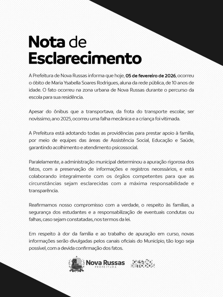Por meio de nota, a Prefeitura de Nova Russas informou que o ônibus escolar é novo, adquirido em 2025, e que uma falha mecânica teria feito a porta se abrir. A gestão garantiu que está prestando apoio aos familiares e que o município arcará com os custos do funeral.