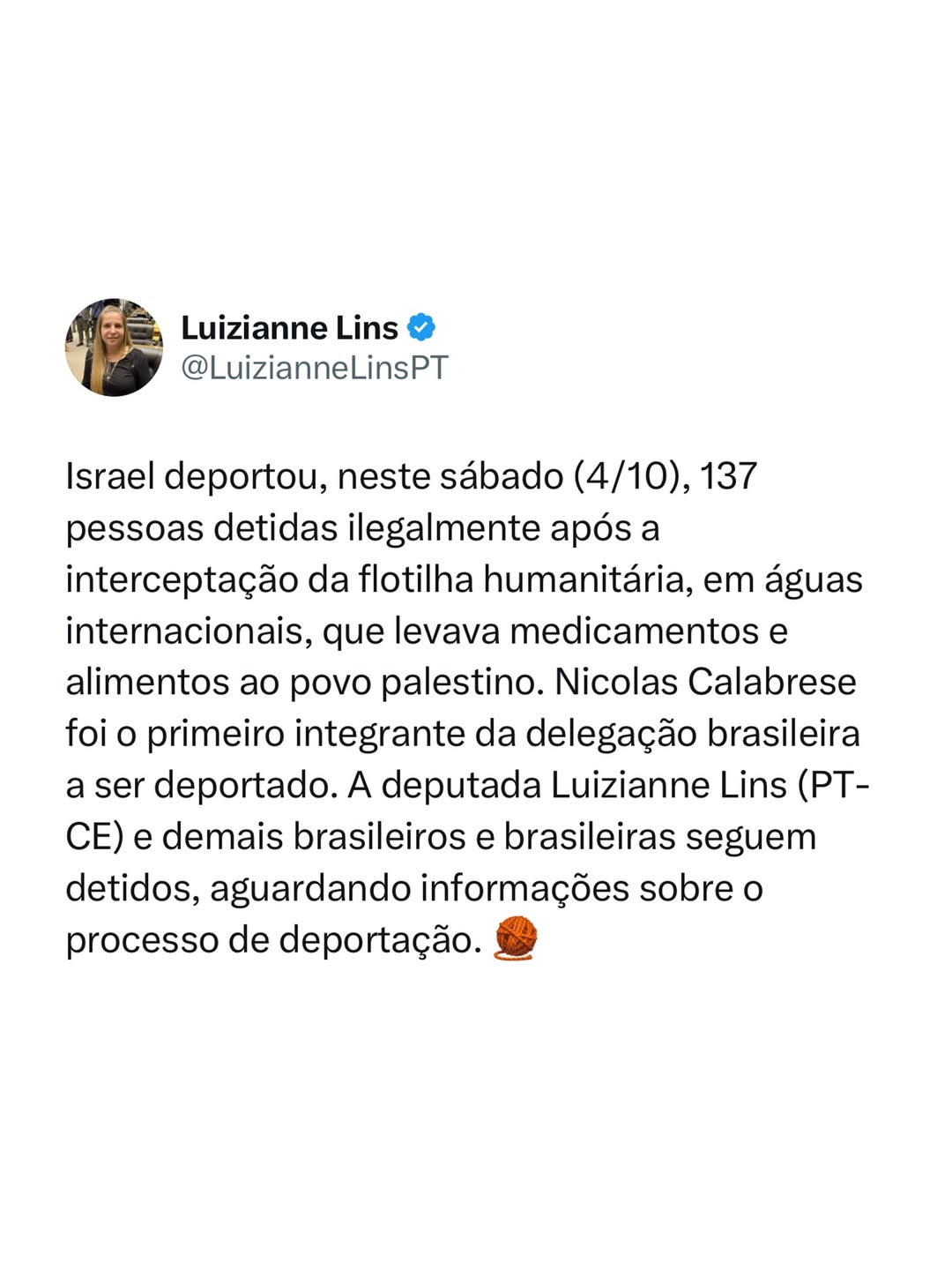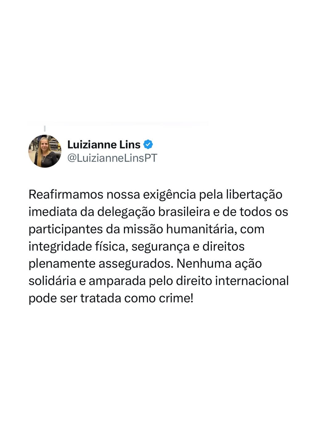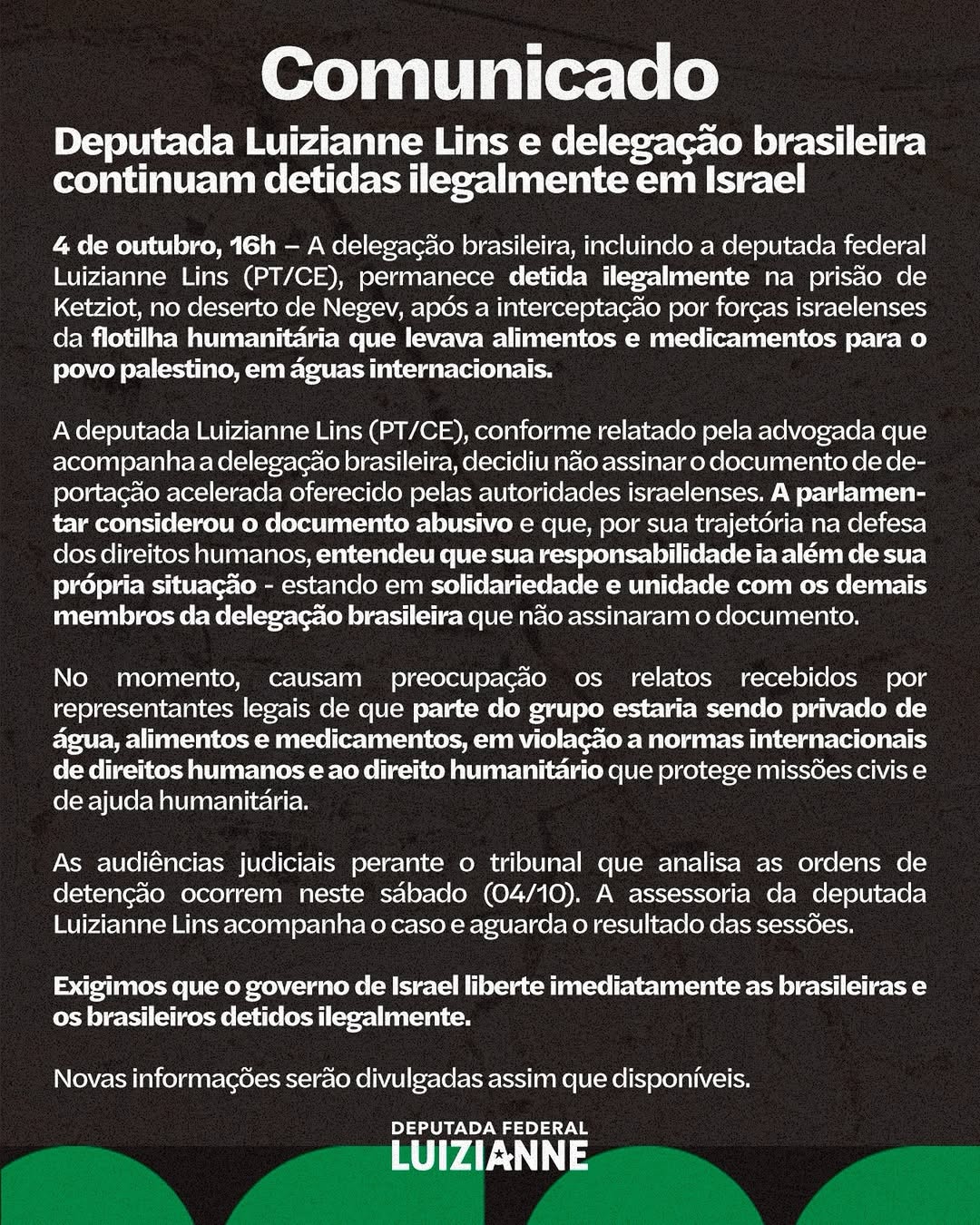 Em nota divulgada neste domingo (5), a assessoria de Luizianne Lins reafirmou a exigência pela libertação imediata da delegação brasileira e dos demais integrantes da flotilha, "com integridade física, segurança e direitos plenamente assegurados", e declarou que "nenhuma ação solidária e amparada pelo direito internacional pode ser tratada como crime".