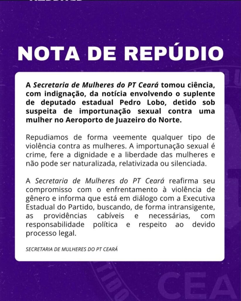 A Executiva Estadual do PT Ceará se reunirá nesta segunda-feira (02) para discutir uma possível punição ao suplente de deputado estadual, Pedro Lobo, que foi acusado de importunação sexual contra uma mulher no Aeroporto Orlando Bezerra de Menezes, em Juazeiro do Norte. O parlamentar foi conduzido para uma delegacia.