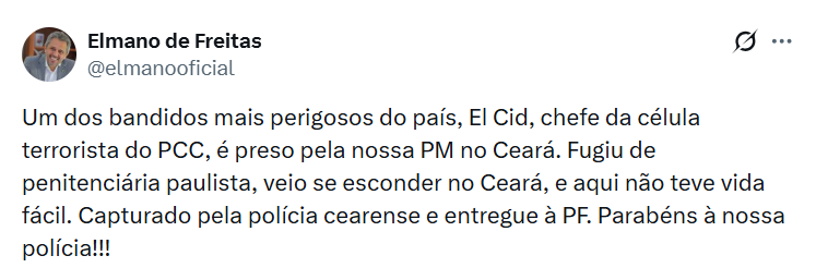 Por meio das redes sociais, o governador Elmano de Freitas comemorou a prisão de "El Cid" e parabenizou o trabalho da PMCE. "Fugiu de penitenciária paulista, veio se esconder no Ceará, e aqui não teve vida fácil. Capturado pela polícia cearense e entregue à PF. Parabéns à nossa polícia!!!", escreveu.