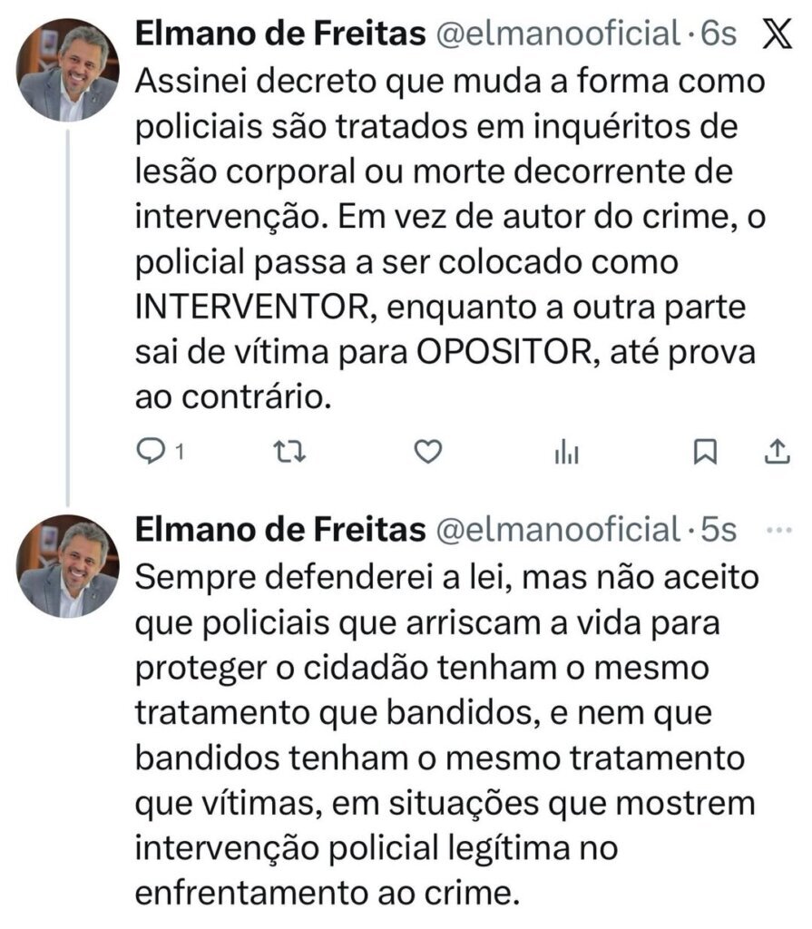 No comunicado, Elmano de Freitas informou que, com a mudança, o policial deixa de ser tratado automaticamente como "autor do crime" e passa a ser classificado como "interventor", enquanto a outra parte envolvida deixa de ser considerada "vítima" e passa à condição de "opositor", até que seja provado o contrário.