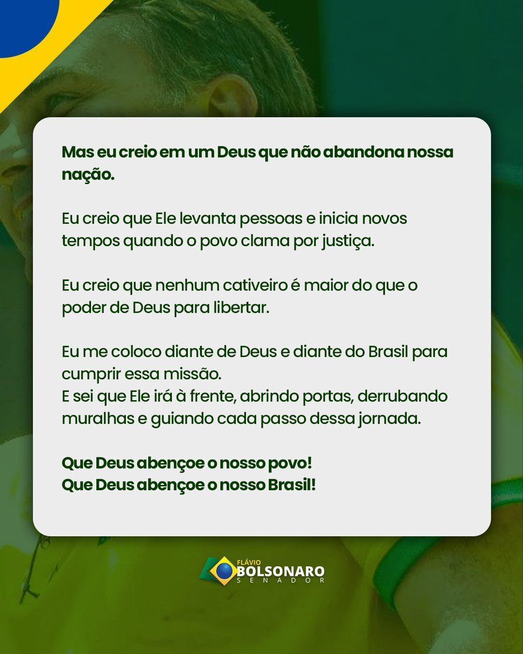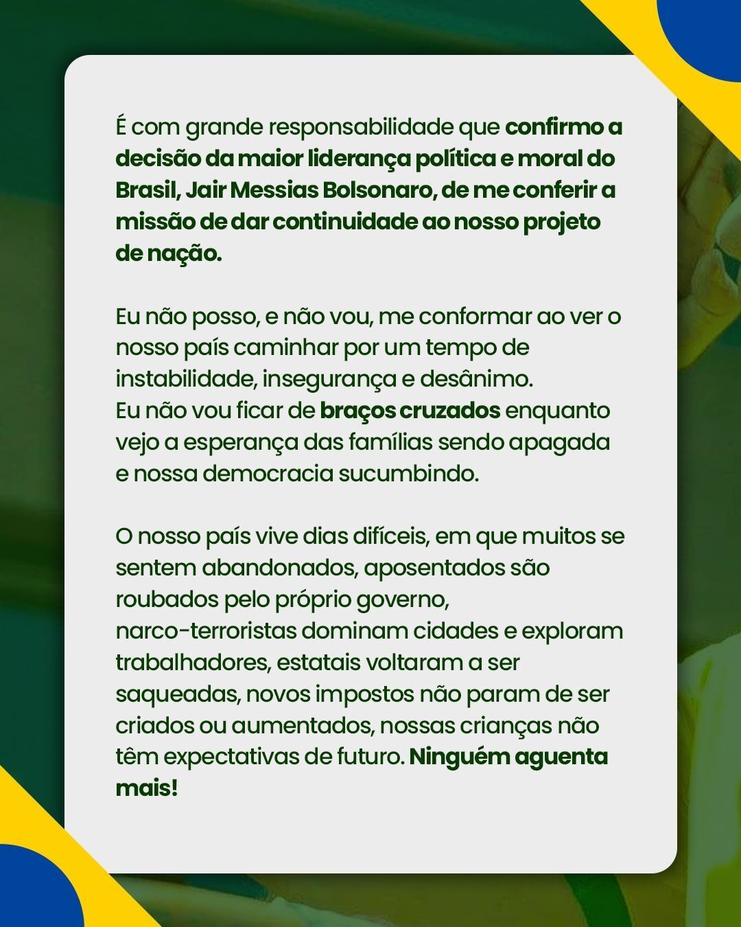 Em mensagem publicada no X (antigo Twitter), Flávio afirmou que recebeu a missão de representar o projeto político de seu grupo na corrida presidencial. "É com grande responsabilidade que confirmo a decisão de Jair Messias Bolsonaro de me conferir a missão de dar continuidade ao nosso projeto de nação", escreveu o senador.