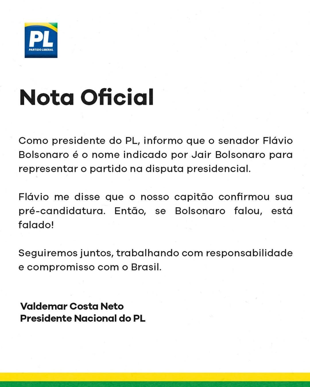 A escolha também foi confirmada pelo presidente nacional do PL, Valdemar da Costa Neto, em nota oficial. Segundo ele, a indicação partiu do próprio Jair Bolsonaro. "Como presidente do PL, informo que o senador Flávio Bolsonaro é o nome indicado por Jair Bolsonaro para representar o partido na disputa presidencial. Flávio me disse que o nosso capitão confirmou sua pré-candidatura. Então, se Bolsonaro falou, está falado. Seguiremos trabalhando com responsabilidade e compromisso com o Brasil", declarou.