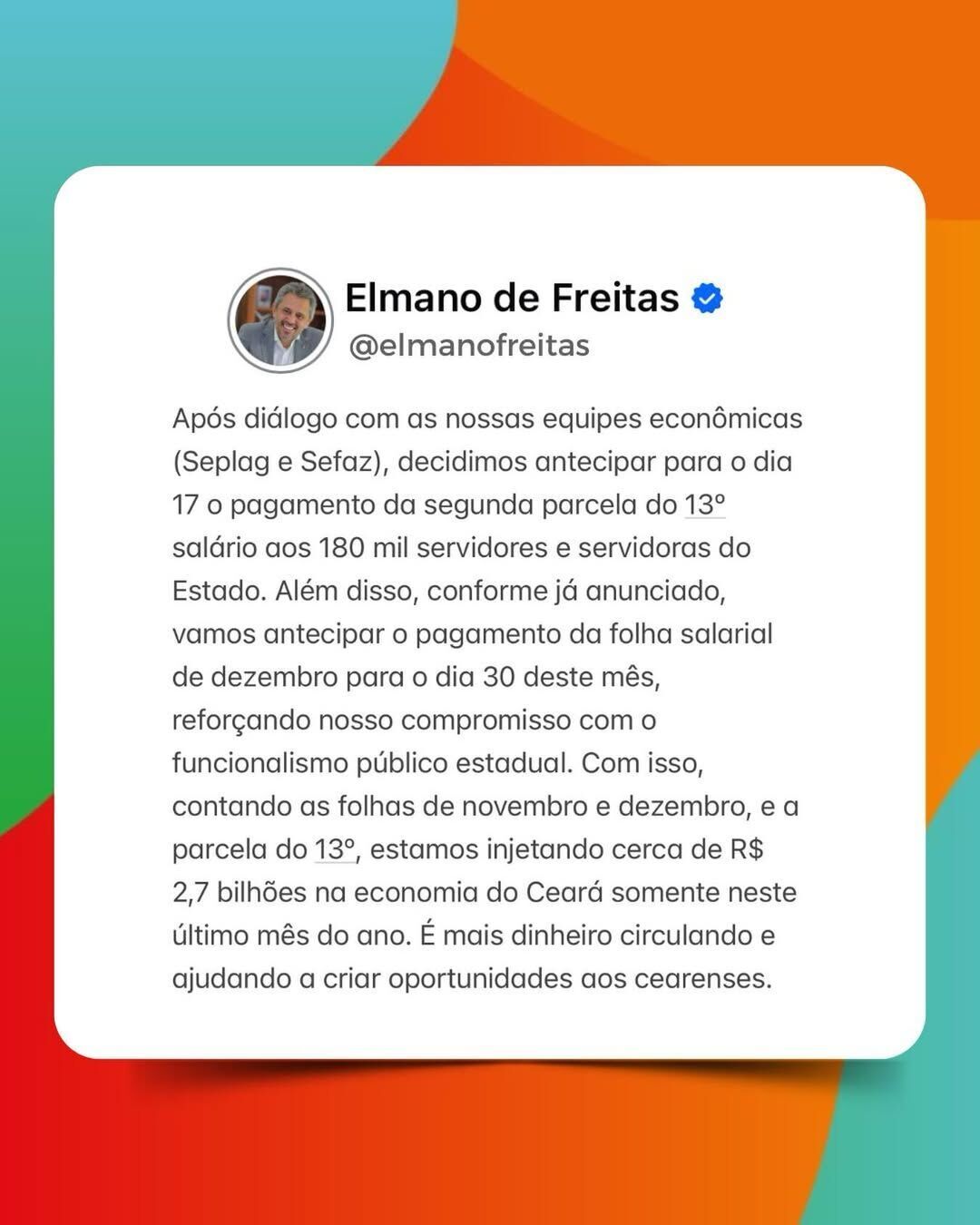O governador Elmano de Freitas anunciou a antecipação do pagamento do 13º salário dos servidores estaduais para dia 17 de dezembro. A folha salarial do mês de dezembro também será antecipada e paga no próximo dia 20. As informações foram compartilhadas nas redes sociais, nesta sexta-feira (12).
