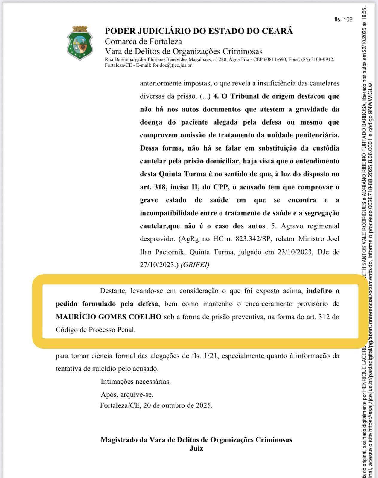 "Destarte, levando-se em consideração o que foi exposto acima, indefiro o pedido formulado pela defesa, bem como mantenho o encarceramento provisório de Maurício Gomes Coelho sob a forma de prisão preventiva, na forma do art. 312 do Código de Processo Penal", diz um trecho do documento.