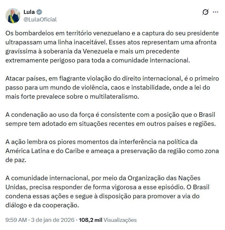Ainda na publicação, o presidente destacou que a posição do Brasil é coerente com a linha histórica adotada pelo país em outros conflitos recentes, baseada na rejeição ao uso da força e na defesa do diálogo como instrumento central da diplomacia. Segundo Lula, o episódio remete a períodos de forte interferência externa na América Latina e no Caribe, colocando em risco o compromisso da região com a paz.