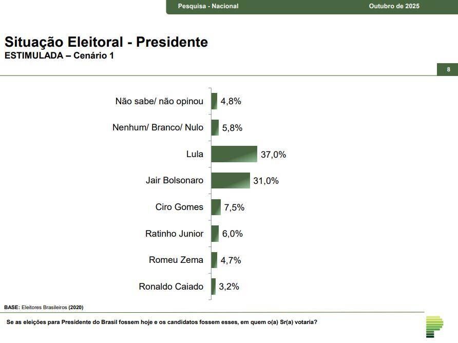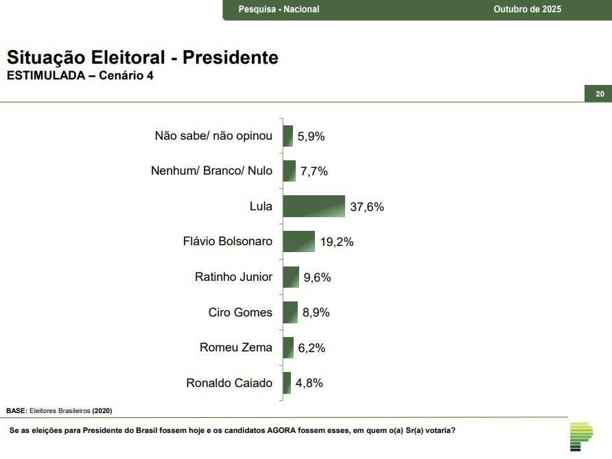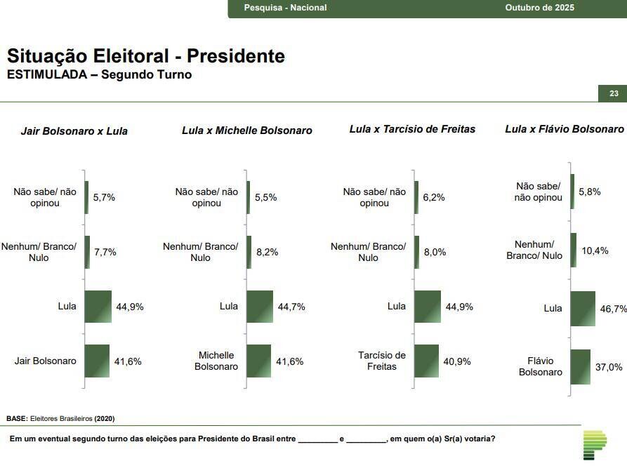 O Instituto Paraná divulgou nesta segunda-feira (27) pesquisa sobre a corrida eleitoral para o Planalto em 2026. O presidente Lula aparece na frente em todos os cenários no primeiro e segundo turno. O petista lidera contra Bolsonaro, Michelle Bolsonaro, Tarcísio de Freitas e Flávio Bolsonaro.