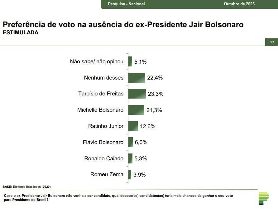 A pesquisa ainda quis saber dos entrevistados votantes de Bolsonaro quem prefeririam na ausência do ex-presidente no pleito.