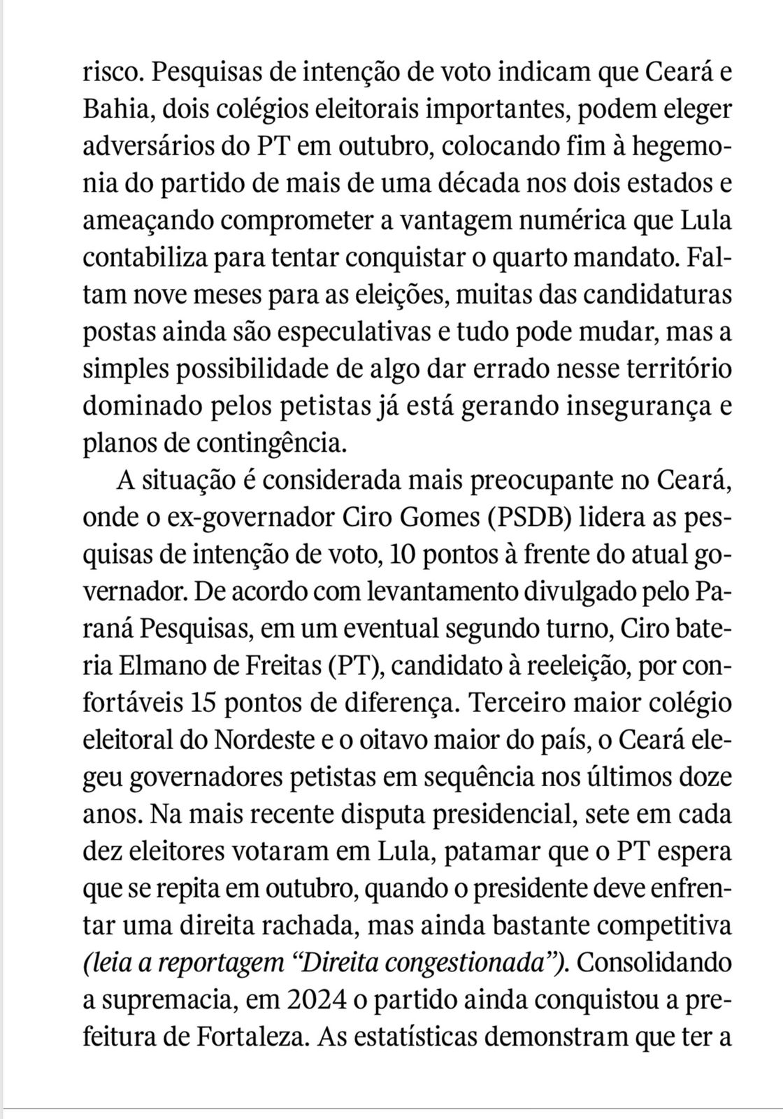 A reportagem ainda destaca que não é comum governadores perderem a reeleição no Brasil, e que Elmano não era visto como um candidato sob ameaça até o fim do ano passado, quando Ciro passou a ser apontado como possível adversário competitivo.