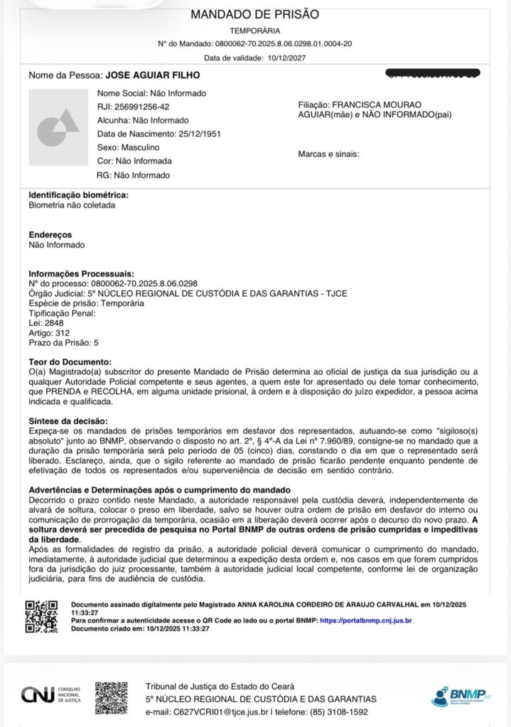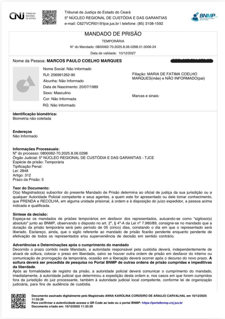 As prisões temporárias foram decretadas pela juíza Anna Karolina Cordeiro de Araújo Carvalhal, titular do 5º Núcleo Regional de Custódia e das Garantias.