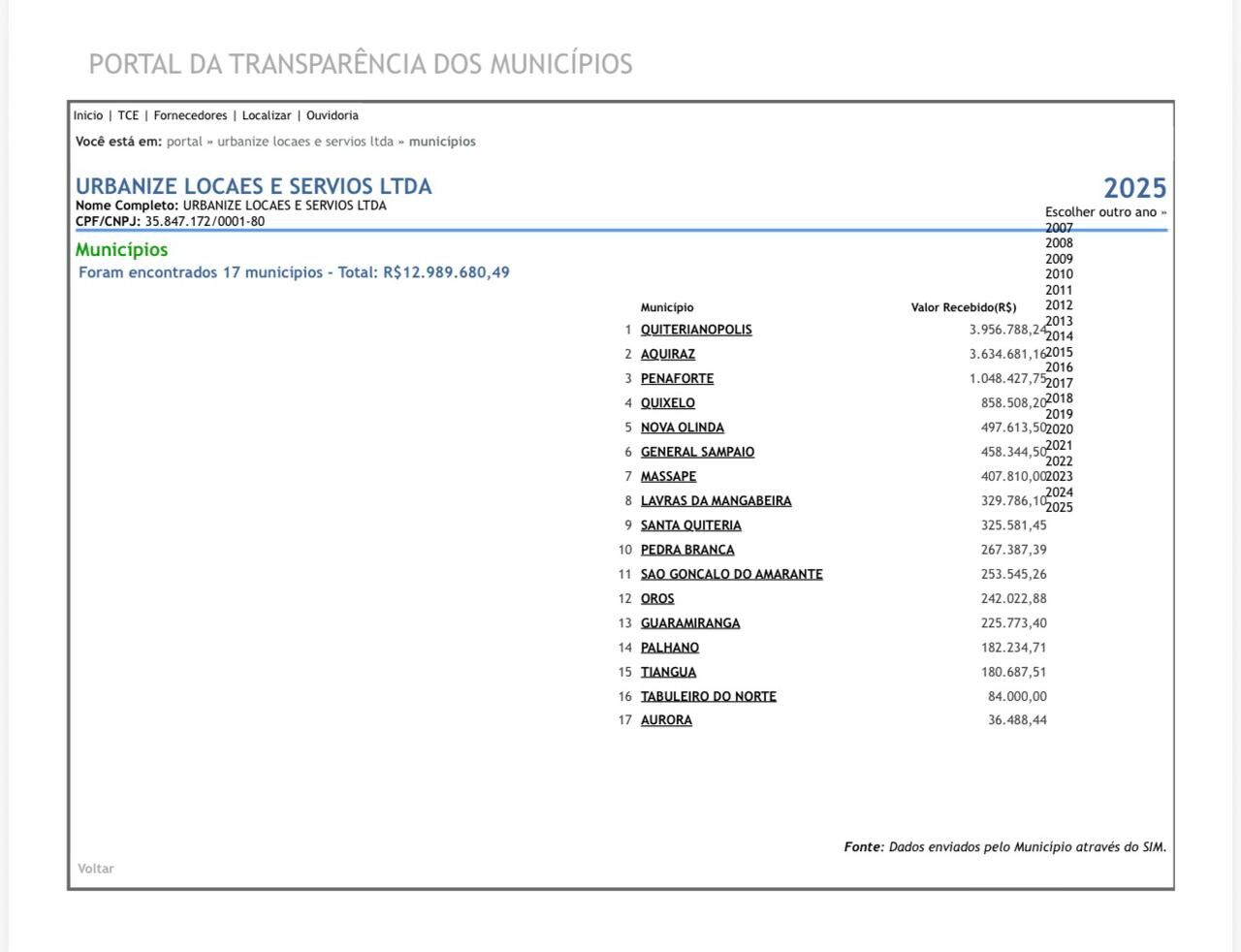 A investigação mira a atuação da empresa Urbanize Locações e Serviços, responsável por contratos com pelo menos 17 prefeituras cearenses. Desde 2020, a empresa teria movimentado mais de R$ 100 milhões em contratos públicos, sendo R$ 12.989.680,49 apenas em 2025. O município onde mais recebeu valores neste ano foi Quiterianópolis, com cerca de R$ 3,9 milhões em pagamentos. Entre 2021 e 2025, os contratos investigados apenas em Quixelô somam R$ 3.794.214,91. A apuração também aponta indícios de crimes como peculato, falsidade ideológica e associação criminosa.