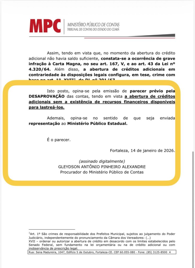 "Isto posto, opina-se pela emissão de parecer prévio pela DESAPROVAÇÃO das contas, tendo em vista a abertura de créditos adicionais sem a existência de recursos financeiros disponíveis para lastreá-los. Ademais, opina-se no sentido de que seja representação ao Ministério Público Estadual. É o parecer", diz um trecho do documento.