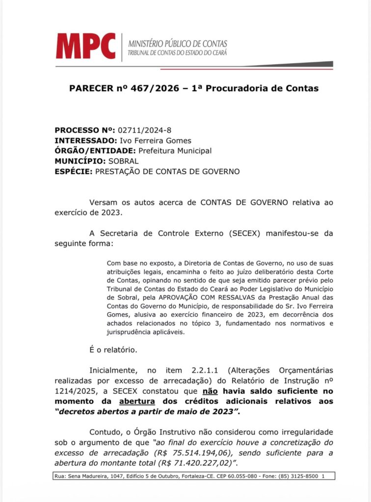 O Ministério Público de Contas do Ceará (MPC-CE) emitiu um parecer pela desaprovação das contas de governo do ex-prefeito de Sobral, Ivo Gomes (PSB), referente ao ano de 2023. O documento foi assinado pelo procurador Gleydson Antônio Pinheiro Alexandre.