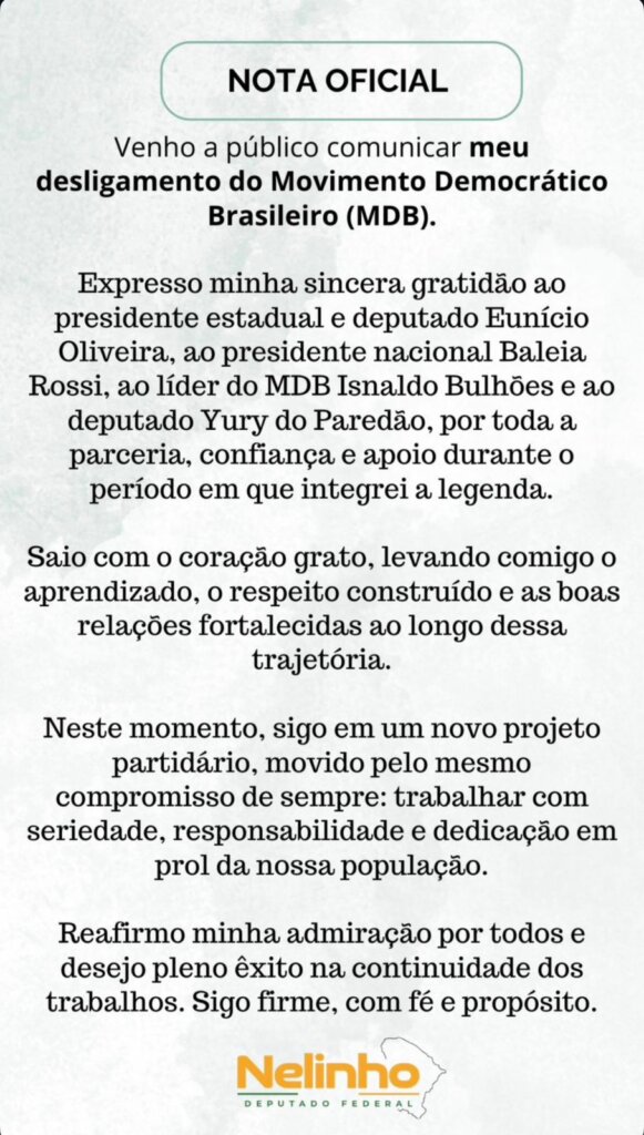 No comunicado, Nelinho afirmou que deixa a legenda com "gratidão" e destacou que seguirá em um novo projeto partidário, mantendo o compromisso com sua atuação parlamentar.