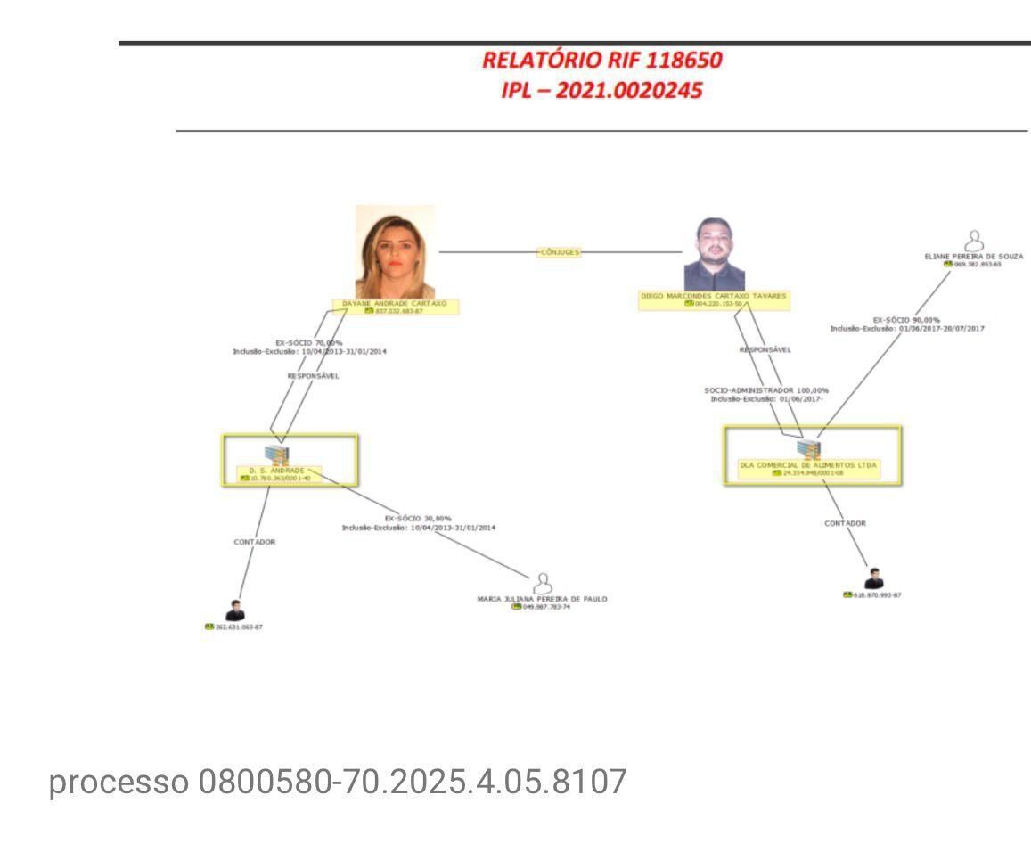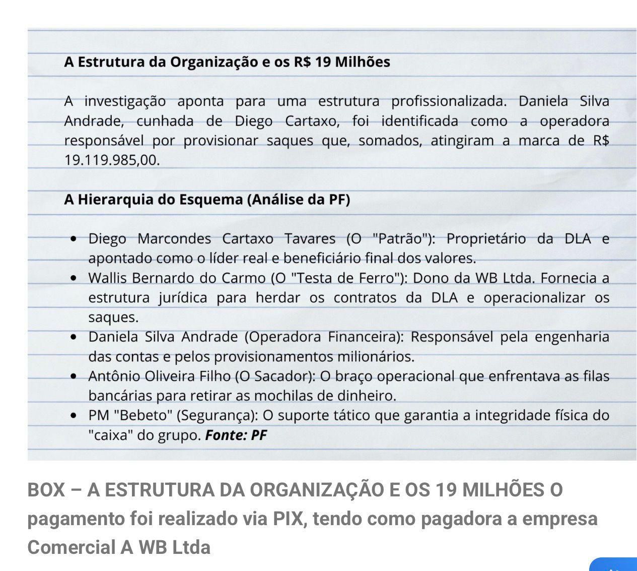 A investigação aponta para uma estrutura profissionalizada. Daniela Silva Andrade, cunhada de Diego Cartaxo, foi identificada como a operadora responsável por provisionar saques que, somados, atingiram a marca de R$ 19.119.985,00.
