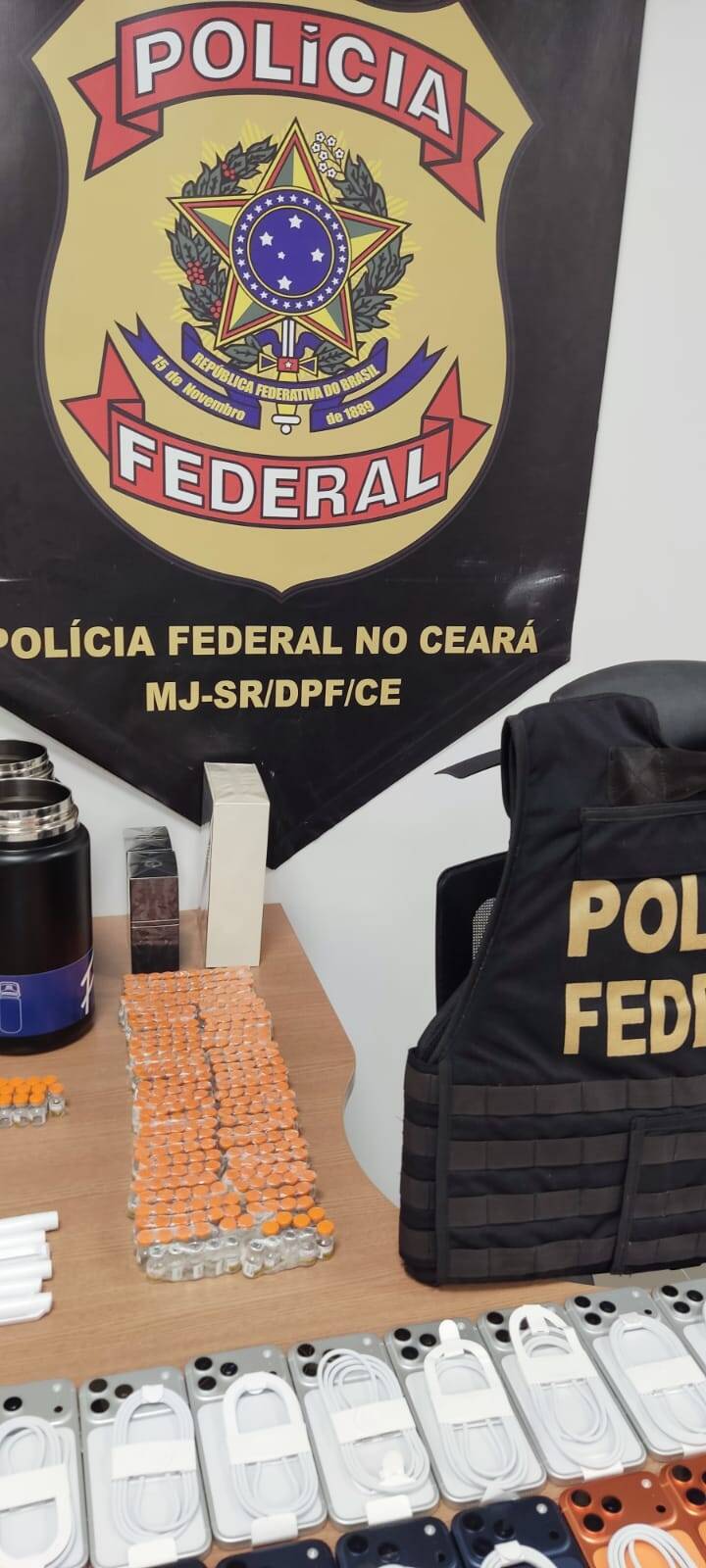 A Polícia Federal (PF) prendeu em flagrante, na madrugada desta sexta-feira (31), um indivíduo que estava sob posse de diversos produtos de origem estrangeira, incluindo aparelhos eletrônicos de última geração, além de ampolas e dispositivos de aplicação de medicamentos, sem nota fiscal. O material foi encontrado na bagagem do passageiro, após fiscalização.