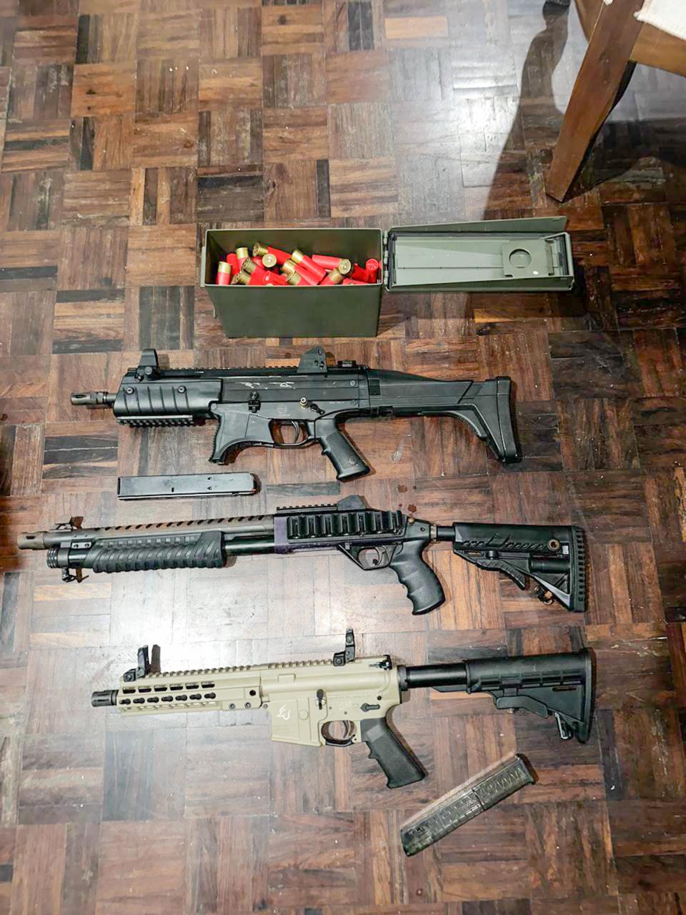 Durante o cumprimento dos mandados, os agentes apreenderam quatro pistolas, um revólver, duas carabinas e uma arma calibre 12, além de munições, dinheiro em espécie, cheques, veículos, documentos, telefones e computadores.