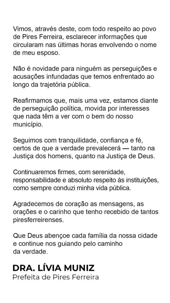 A prefeita de Pires Ferreira, Dra. Lívia Muniz, publicou nesta quarta-feira (28) uma nota nos stories do Instagram em que atribui a prisão de seu marido, Marcos Paulo, a uma suposta perseguição política. Ele foi alvo de uma operação do Ministério Público do Estado do Ceará (MPCE). No comunicado, a gestora afirma que "não é novidade para ninguém as perseguições e acusações infundadas" enfrentadas por ela e por sua família ao longo da trajetória pública. Em seguida, reforça que acredita estar diante de "mais uma vez" uma ação motivada por interesses políticos.