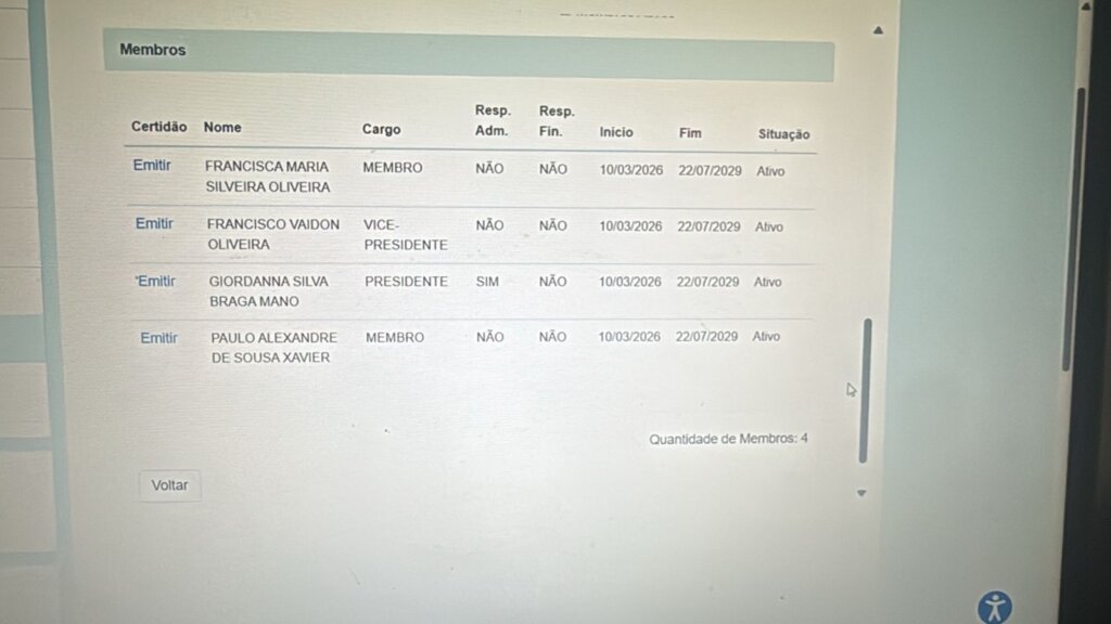 A confirmação veio com o registro do documento no sistema do Tribunal Superior Eleitoral, que já apresenta Giordanna Mano como presidente estadual da federação partidária. Na composição da direção, o dirigente Vaidon Oliveira aparece como vice-presidente.