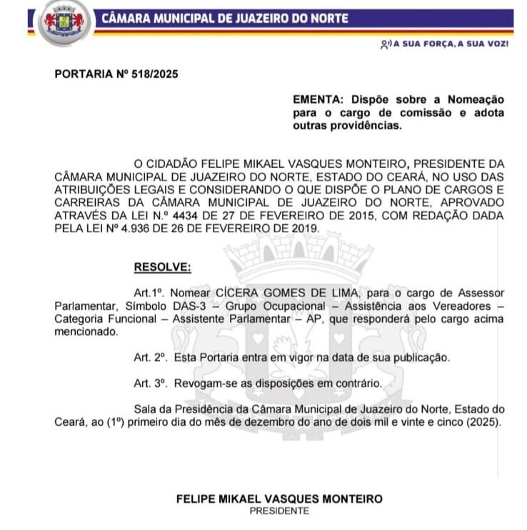 "O cidadão Felipe Mikael Vasques Monteiro, presidente da Câmara Municipal de Juazeiro do Norte, Estado do Ceará, no uso das atribuições legais e considerando o que dispõe o Plano de Cargos e Carreiras da Câmara Municipal de Juazeiro do Norte resolve nomear Cicera Gomes de Lima, para o cargo de Assessor Parlamentar, símbolo DAS-3 Grupo Ocupacional - Assistência aos Vereadores categoria funcional - Assistente Parlamentar - Ap, que responderá pelo cargo acima mencionado", diz um trecho do documento de nomeação.