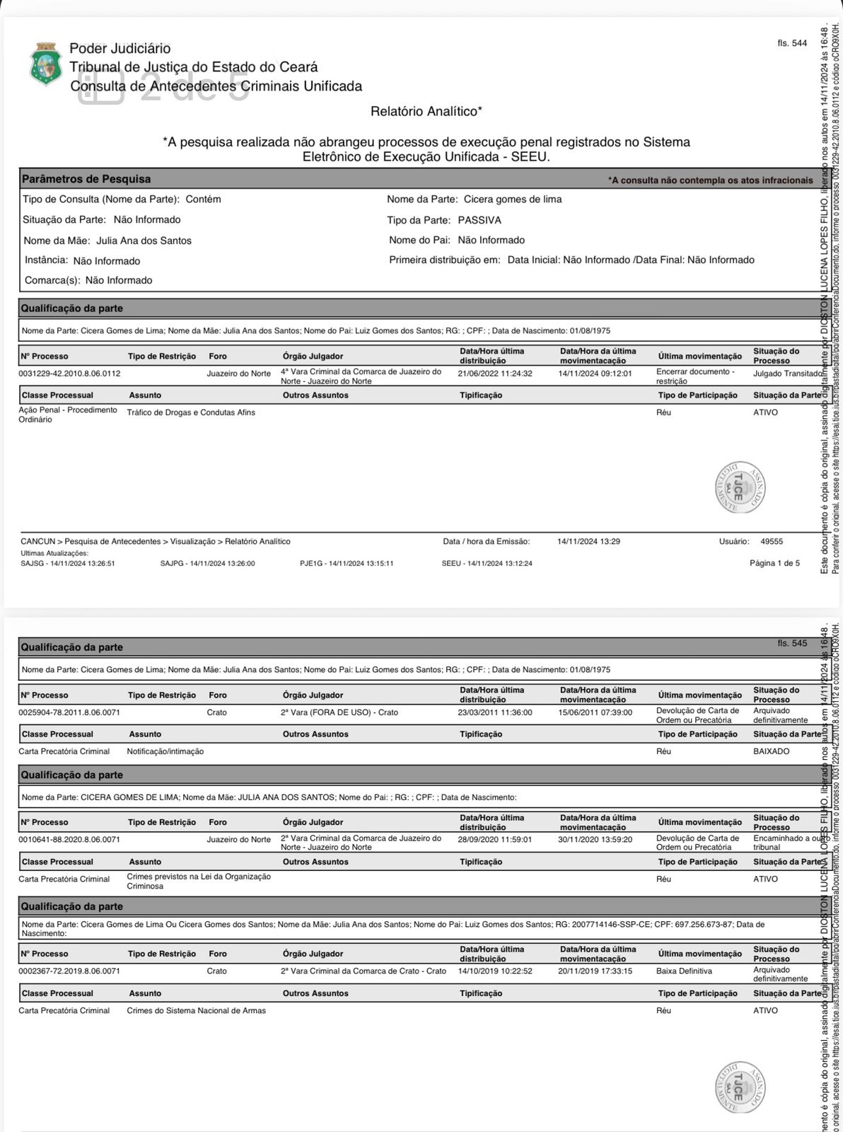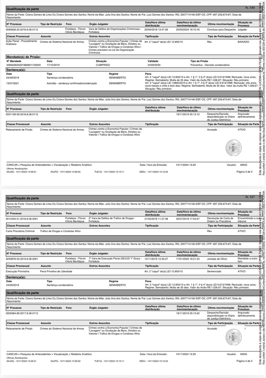 Cícera Gomes da Silva, que seria conhecida como 'Cícera do Fuzil', possui registros na Justiça envolvendo condenações por crimes como tráfico de drogas e organização criminosa. Conforme decisões judiciais disponíveis em documentos públicos, ela chegou a ser presa e cumpriu pena em regime semiaberto.