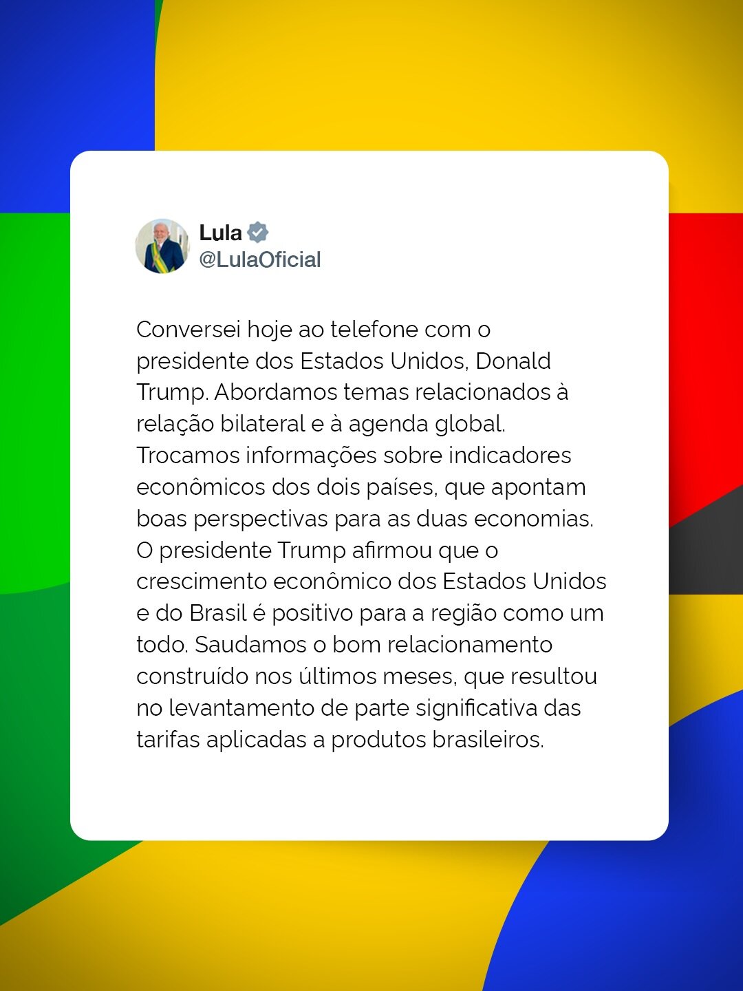 Em publicação nas redes sociais, Lula afirmou que os dois trocaram informações sobre indicadores econômicos dos dois países, que apontariam boas perspectivas para as economias brasileira e norte-americana. Ainda de acordo com o presidente, Trump avaliou que o crescimento econômico de Brasil e Estados Unidos é positivo para a região como um todo.