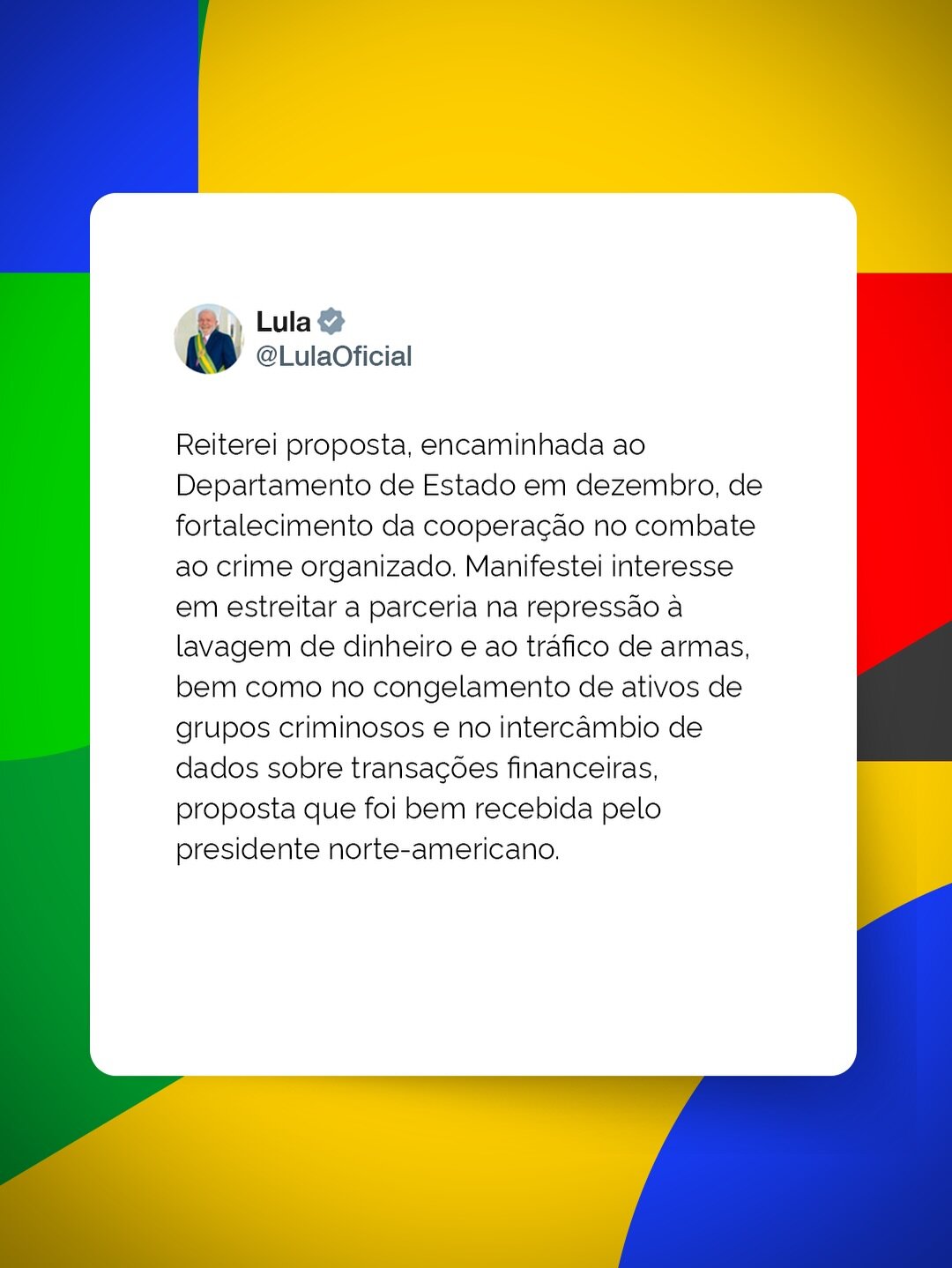 O presidente da República disse ter reiterado uma proposta encaminhada ao Departamento de Estado norte-americano em dezembro, voltada ao fortalecimento da cooperação no combate ao crime organizado. Entre os pontos citados por Lula estão ações conjuntas para repressão à lavagem de dinheiro e ao tráfico de armas, congelamento de ativos de grupos criminosos e intercâmbio de dados sobre transações financeiras.