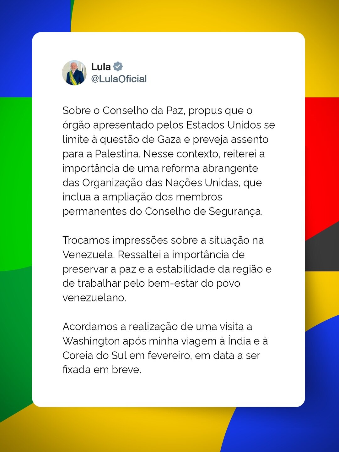 Lula afirmou ter tratado com Trump sobre o chamado Conselho da Paz, defendendo que a iniciativa proposta pelos Estados Unidos se limite ao tema de Gaza e preveja a participação para a Palestina. No mesmo contexto, Lula voltou a defender uma reforma abrangente da Organização das Nações Unidas (ONU), com ampliação dos membros permanentes do Conselho de Segurança.