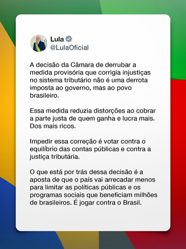 O presidente Lula reagiu nesta quinta-feira (9) à decisão da Câmara dos Deputados que resultou na caducidade da Medida Provisória (MP) que alterava regras do Imposto sobre Operações Financeiras (IOF). Segundo ele, a decisão "não é uma derrota imposta ao governo, mas ao povo brasileiro".