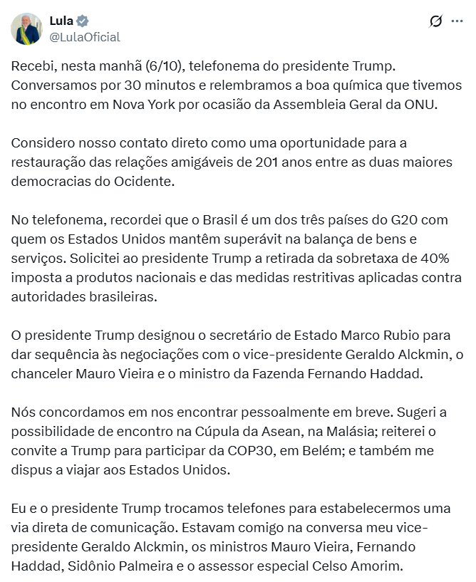 Durante a conversa, Lula destacou que o Brasil é um dos poucos países do G20 com os quais os EUA mantêm superávit comercial e defendeu a normalização das relações bilaterais. Trump, por sua vez, designou o secretário de Estado, Marco Rubio, para conduzir as negociações com o vice-presidente Geraldo Alckmin, o chanceler Mauro Vieira e o ministro da Fazenda Fernando Haddad.