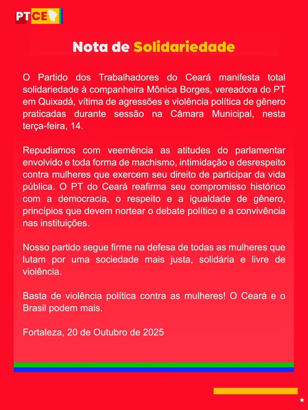 Na nota, o PT do Ceará repudiou a conduta atribuída ao parlamentar envolvido e destacou que episódios dessa natureza configuram práticas de machismo e atentam contra o direito das mulheres de exercerem plenamente seus mandatos e participarem da vida pública em ambiente seguro e democrático. O partido reiterou seu compromisso com a defesa da igualdade de gênero e com o enfrentamento de toda forma de violência institucional.