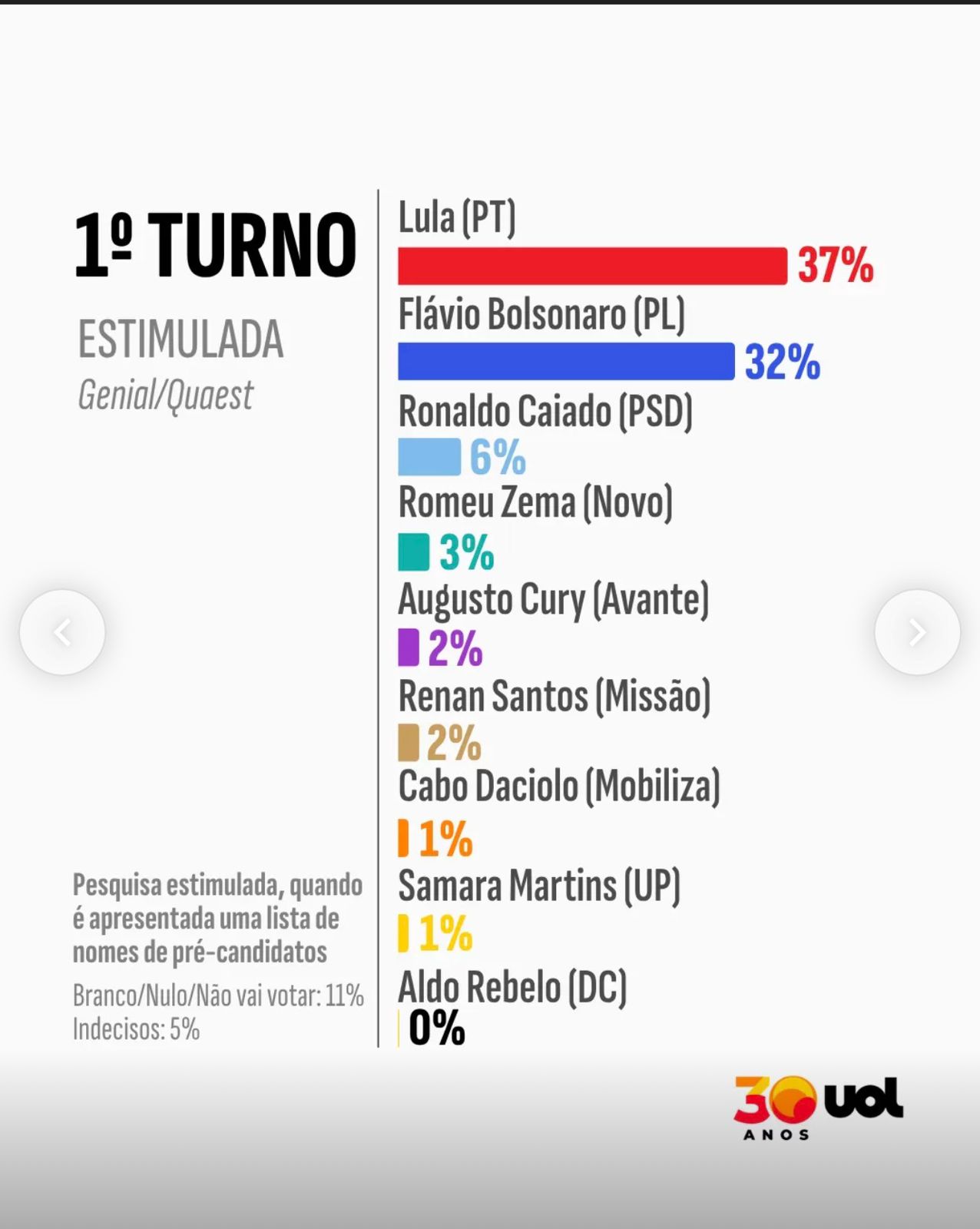 Quaest aponta liderança de Lula no 1º turno e vitória de Flávio Bolsonaro no 2º
