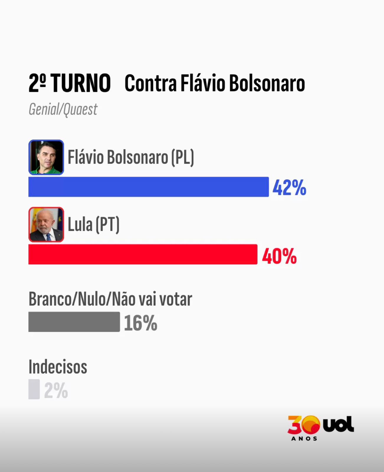 Uma pesquisa realizada pelo Instituto Quaest, divulgada nesta quarta-feira (15), aponta cenários distintos na disputa pelo Planalto entre o presidente Lula (PT) e o senador Flávio Bolsonaro (PL). A pesquisa foi encomendada pela Genial Investimentos e realizada entre os dias 9 e 13 de abril, com 2.004 entrevistas presenciais com pessoas de 16 anos ou mais. A margem de erro é de dois pontos percentuais, para mais ou para menos, com nível de confiança de 95%.