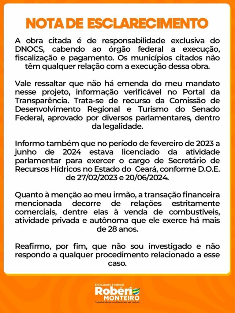 Em nota, o parlamentar afirmou que a obra mencionada é de responsabilidade exclusiva do DNOCS, cabendo ao órgão federal a execução, fiscalização e pagamento. Segundo ele, os municípios citados na reportagem não possuem vínculo com a execução do projeto.