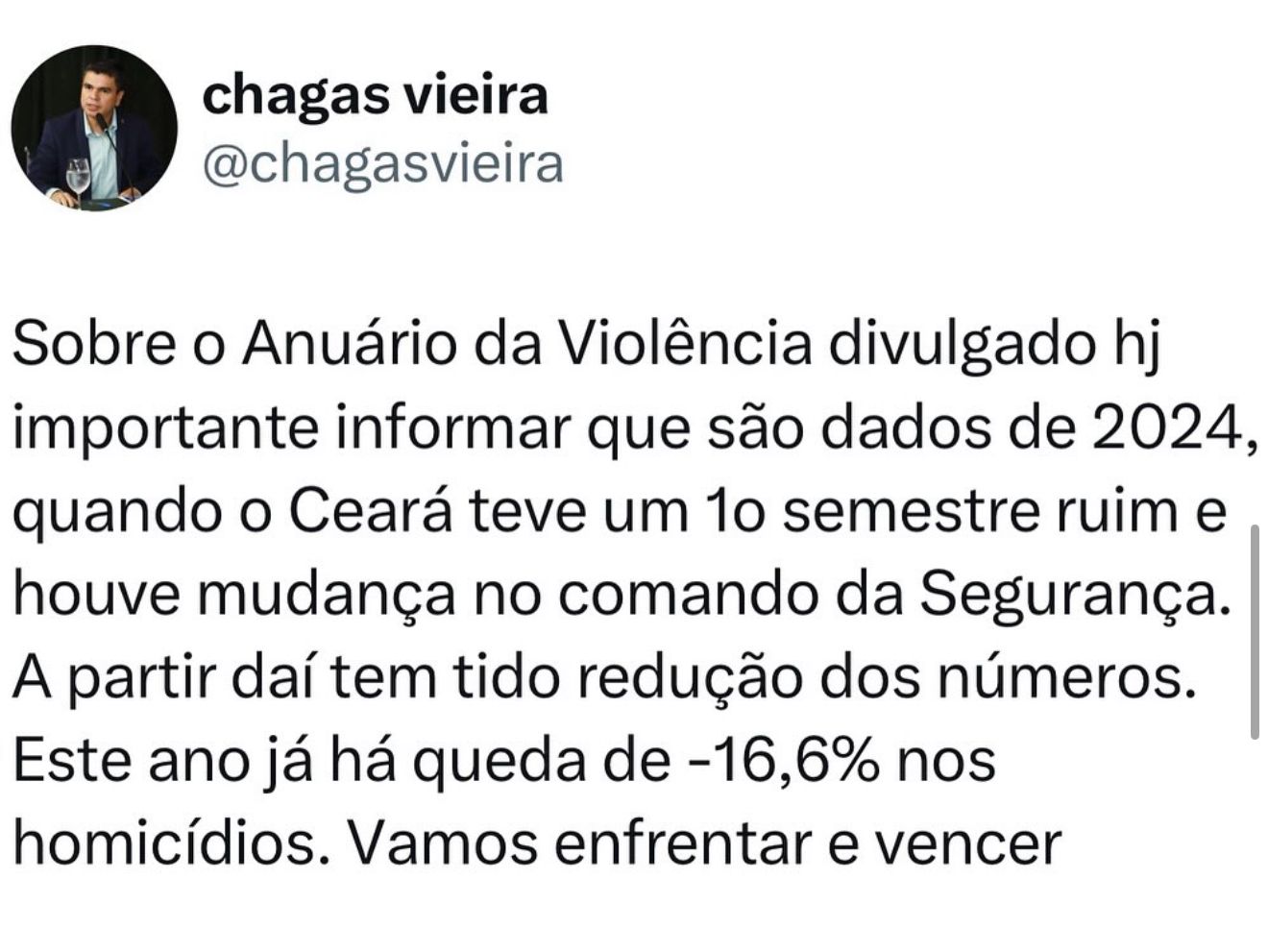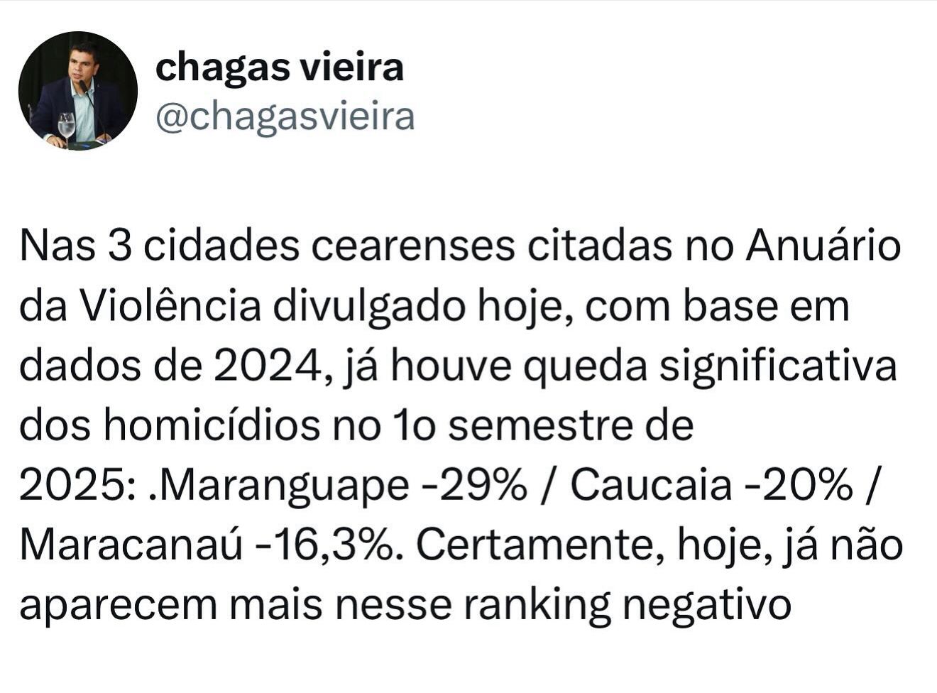 O secretário-chefe da Casa Civil, Chagas Vieira, afirmou nesta quinta-feira (24), por meio de publicação nas redes sociais, que o Ceará registrou redução de 16,6% nos homicídios no primeiro semestre de 2025. A declaração ocorreu após a divulgação do Anuário Brasileiro de Segurança Pública 2025, produzido pelo Fórum Brasileiro de Segurança Pública (FBSP).