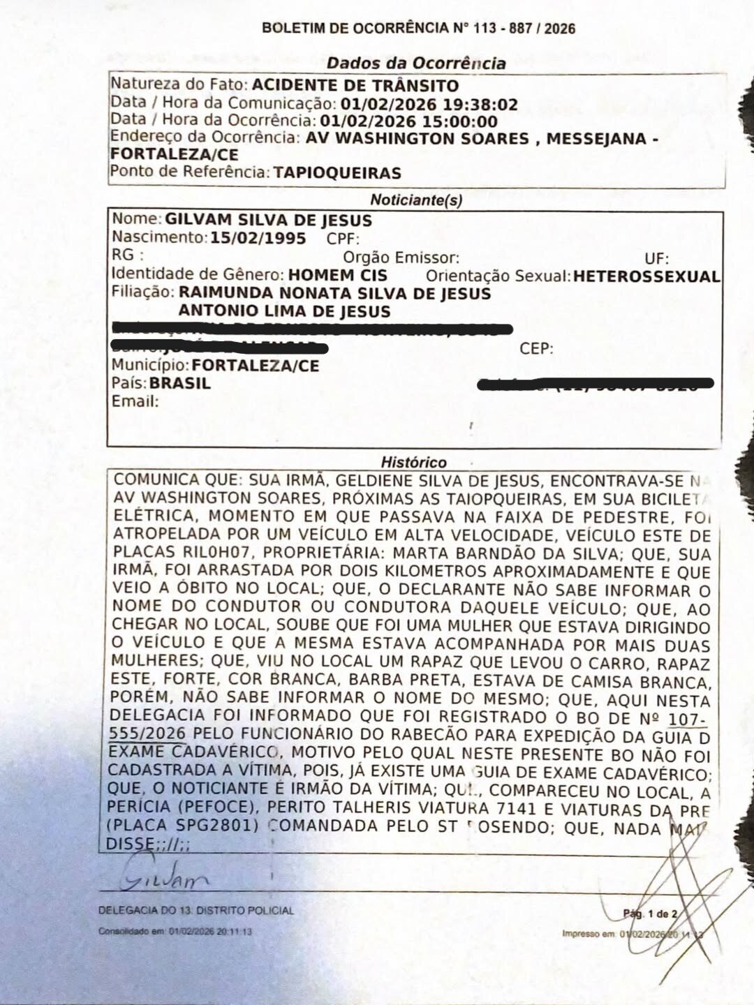 Por meio de Boletim de Ocorrência (BO), o irmão da vítima, Gilvan Silva, afirmou que Geldiene foi atingida no momento em que passava pela faixa de pedestres. No relato apresentado à autoridade policial, o irmão afirma ainda que o corpo teria sido arrastado após o impacto.