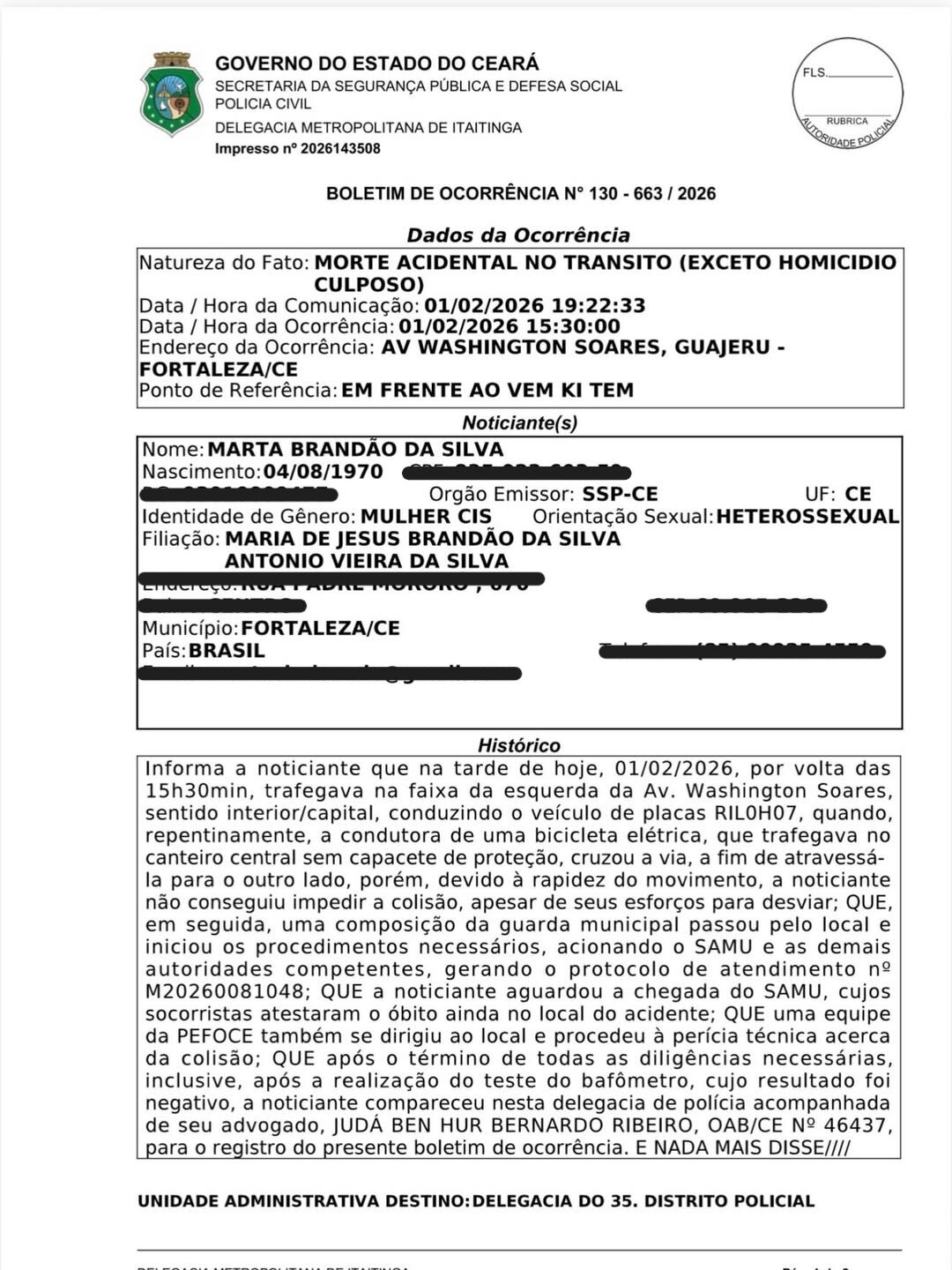Martinha afirmou que permaneceu no local aguardando a chegada do Samu, e que os socorristas constataram o óbito ainda na ocorrência. Uma equipe da Perícia Forense do Estado do Ceará (Pefoce) também foi acionada e realizou os trabalhos periciais no local. Após a conclusão das diligências iniciais, a suplente de deputada estadual relatou ter realizado teste do bafômetro, com resultado negativo.