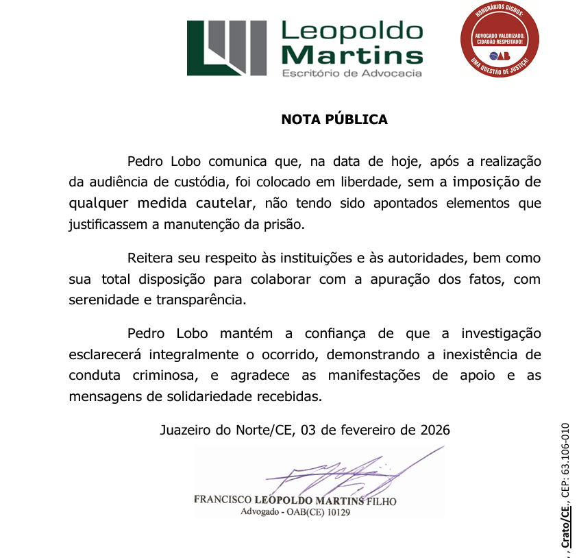O suplente de deputado estadual Pedro Lobo (PT), detido, na manhã desta segunda-feira (2), após ser acusado de importunação sexual contra uma mulher no Aeroporto de Juazeiro do Norte foi colocado em liberdade, após audiência de custódia.
