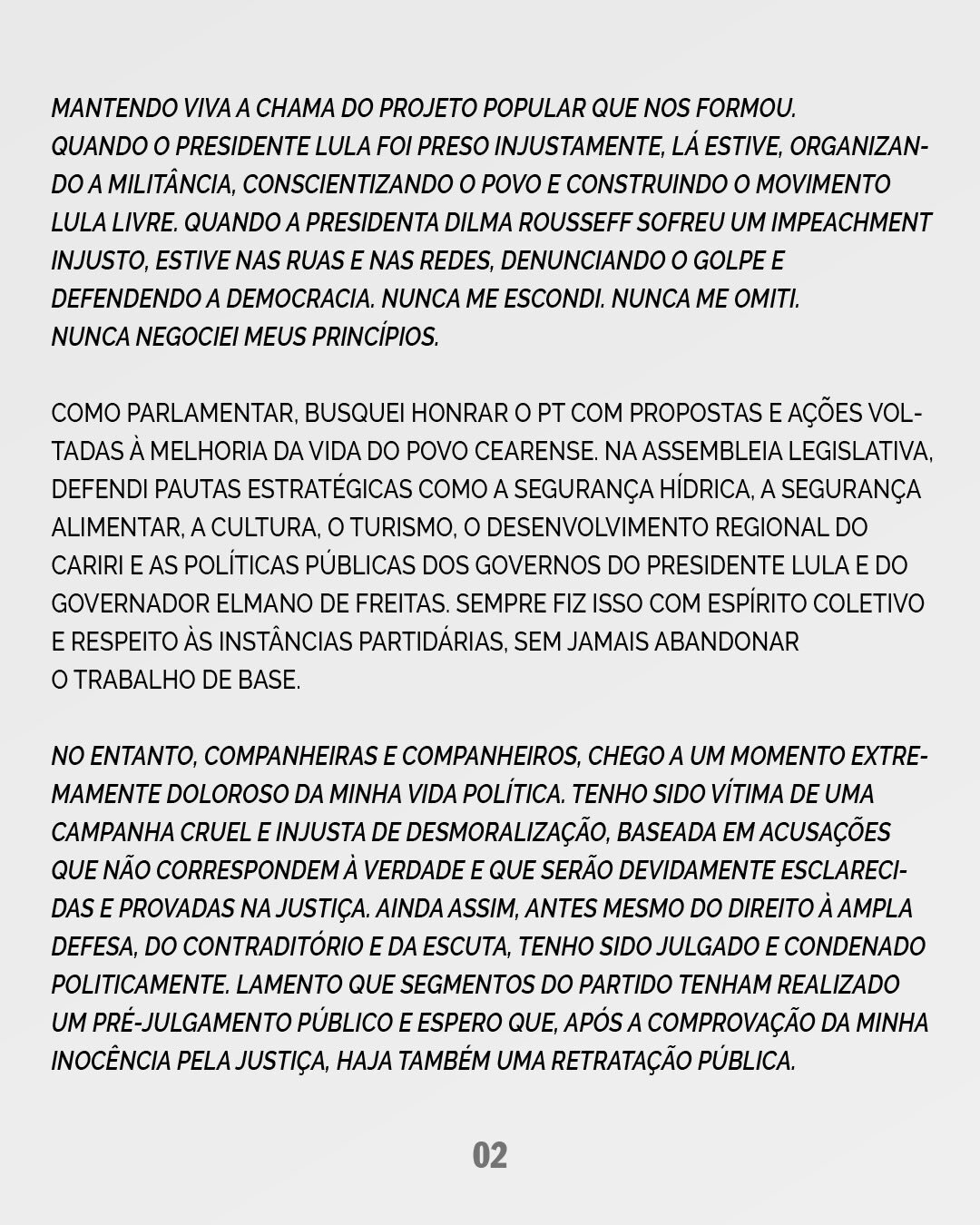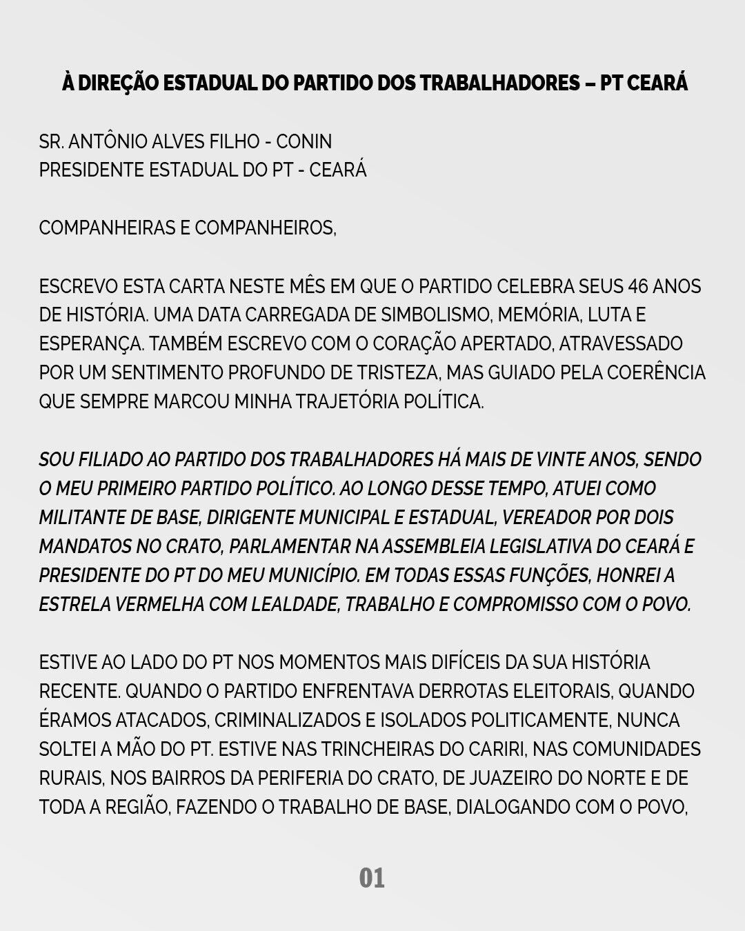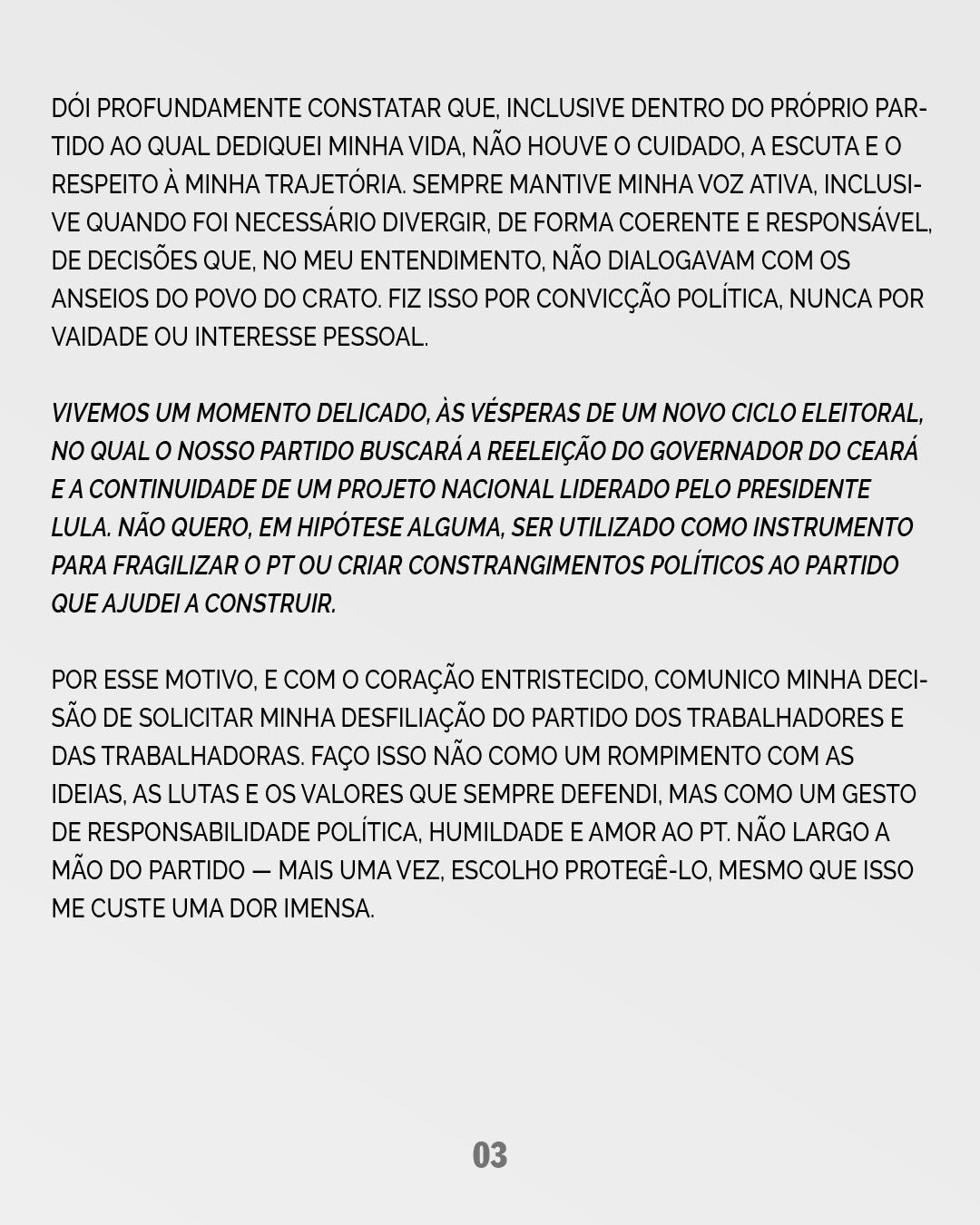 "Diante de um cenário de pré-julgamento e da ausência de escuta, escolho assumir minha responsabilidade política. Solicitei, no dia 19 de fevereiro de 2026, minha desfiliação, não como rompimento com as ideias que sempre defendi, mas como forma de respeito à minha trajetória e compromisso com o projeto coletivo", diz em um trecho da carta.