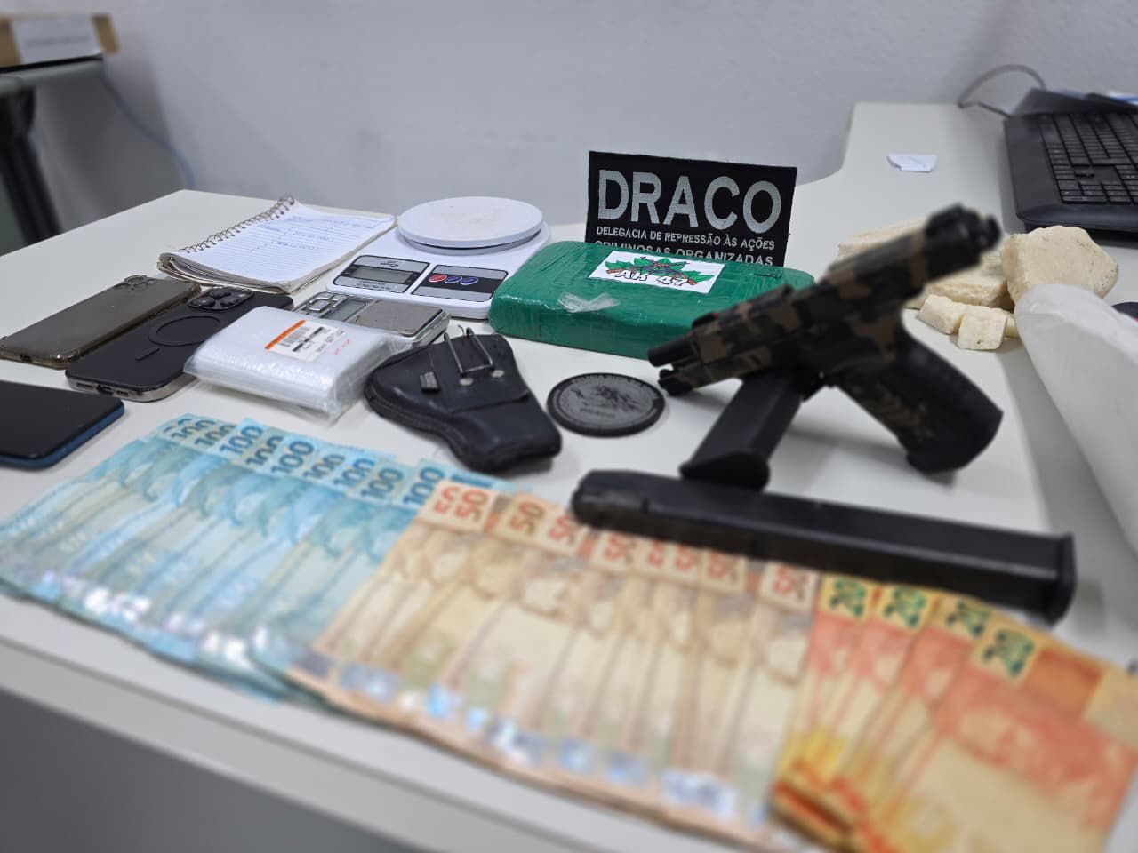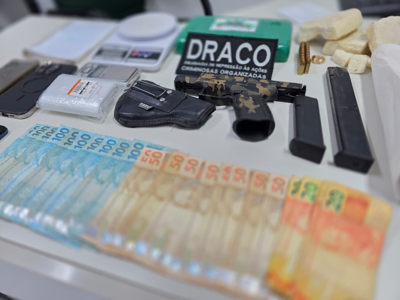 A ação foi conduzida pela Delegacia de Repressão às Ações Criminosas Organizadas (Draco), após levantamentos de inteligência que identificaram o endereço onde o suspeito escondia o material ilícito. No imóvel, os agentes encontraram uma pistola, carregadores — incluindo um modelo alongado —, pouco mais de um quilo de cocaína e crack, quantia em dinheiro, celulares e apetrechos usados no fracionamento e comercialização de entorpecentes.