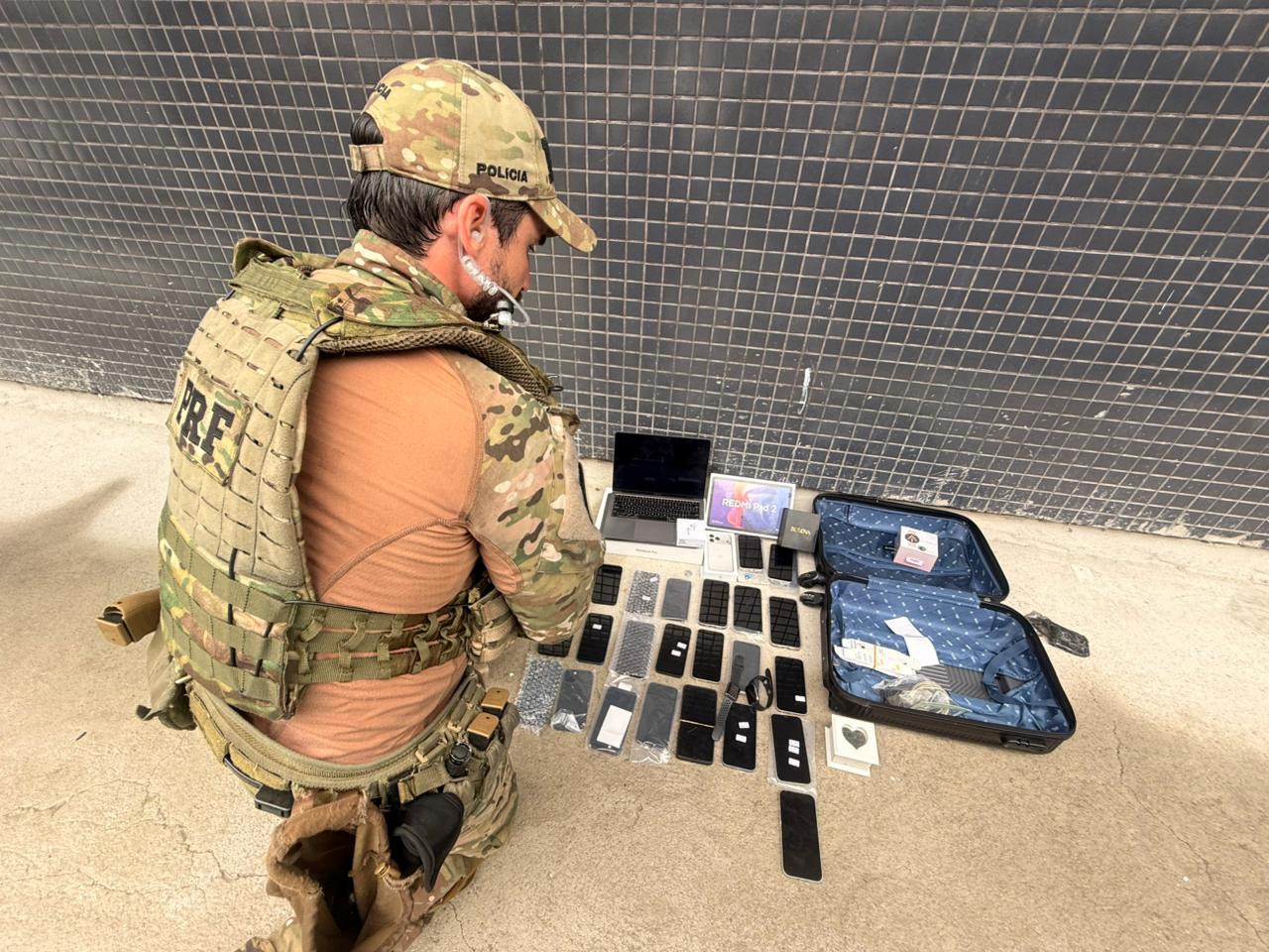 A abordagem ocorreu por volta das 10h, no km 65 da rodovia, quando os policiais pararam um Hyundai HB20 branco. Durante a verificação inicial, foram identificados diversos aparelhos eletrônicos no interior do carro. Entre os itens, estavam 25 iPhones, dois MacBooks, dois Apple Watch e outros dispositivos, todos sem documentação fiscal.
