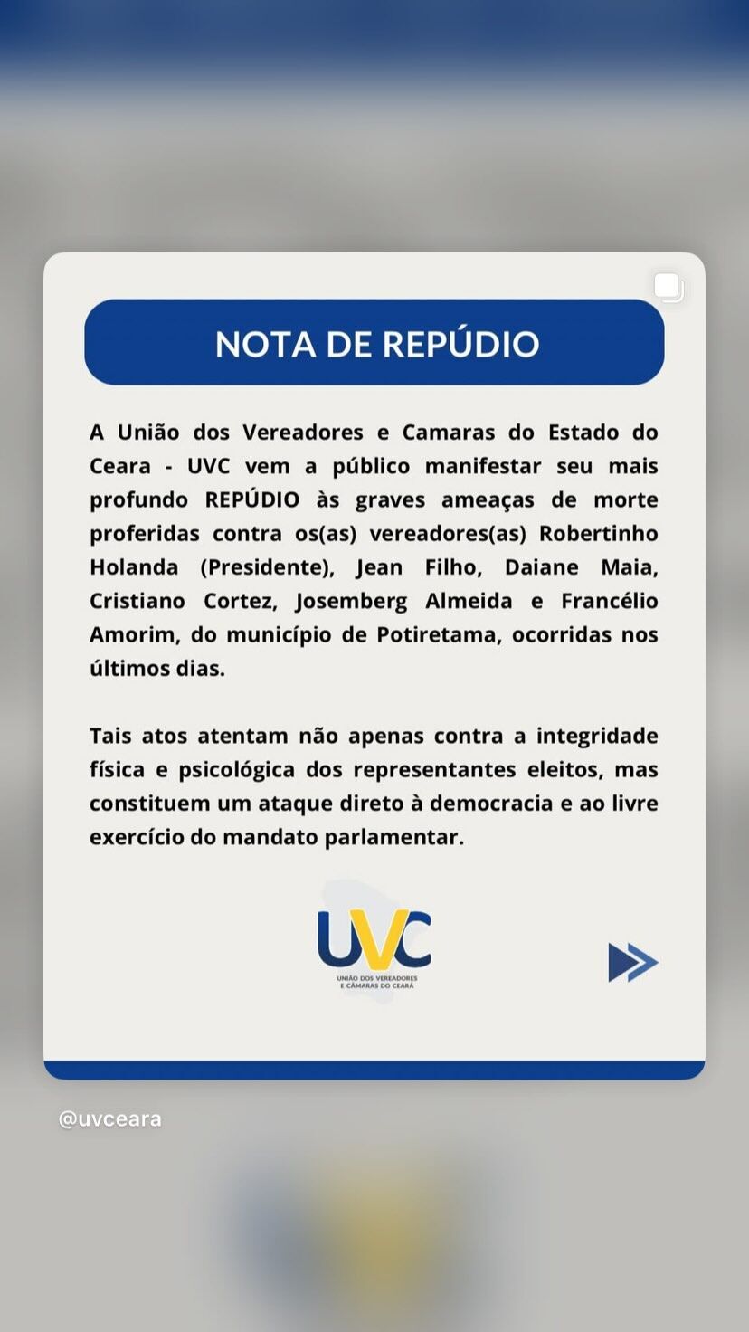A União dos Vereadores e Câmaras do Estado do Ceará se manifestou, através de uma nota de repúdio, às graves ameaças de morte proferidas contra os vereadores Robertinho Holanda (Presidente), Jean Filho, Daiane Maia, Cristiano Cortez, Josemberg Almeida e Francélio Amorim, do município de Potiretama, ocorridas nos últimos dias.