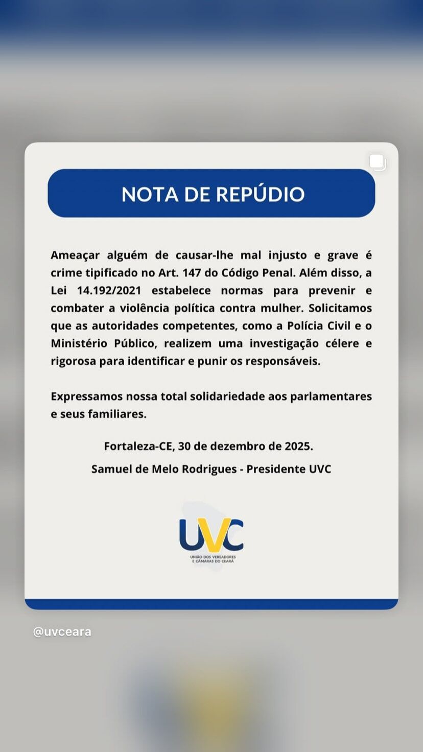 A nota reforçou ainda que ameaçar alguém de causar-lhe mal injusto e grave é crime tipificado no Art. 147 do Código Penal. Além disso, a Lei 14.192/2021 estabelece normas para prevenir e combater a violência política contra mulher. Solicitamos que as autoridades competentes, como a Polícia Civil e o Ministério Público, realizem uma investigação célere e rigorosa para identificar e punir os responsáveis.